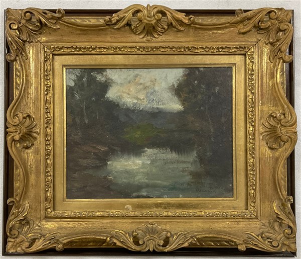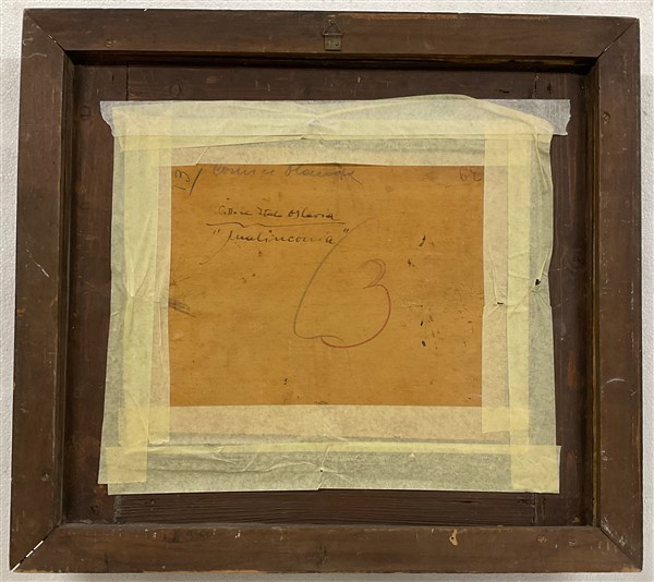 "Malinconia" olio su compensato (cm 30x34) Firmato in basso a destra. Al retro: firmato e titolato. In cornice dorata e intagliata (difetti)