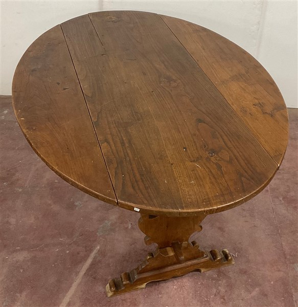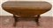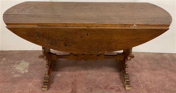 Tavolo fratino ad alette in legno tinto con piano ovale, gambe sagomate riunite da traversa (cm 156x107xh80- chiuso cm 59) (difetti)