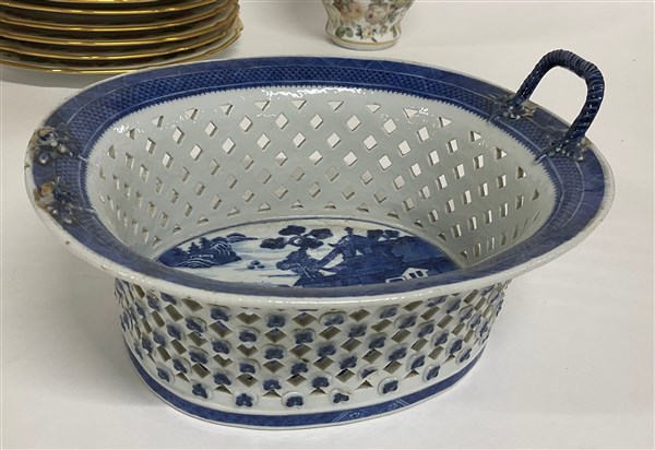 Lotto composto da sette piatti in porcellana a decoro floreale e profili in oro manifattura Limoges, una coppia di vasi e un cesto in porcellana (difetti e mancanze)