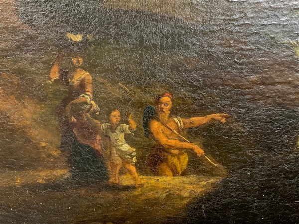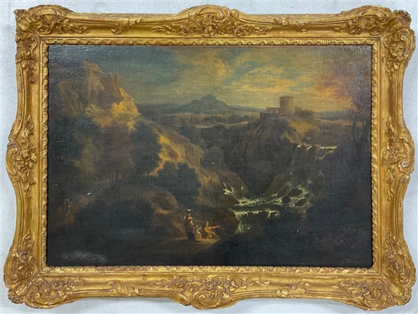 Lotto 1635 | Ignoto della prima metà del XIX Secolo, "Paesaggio con viandanti" (cm 42x61) In