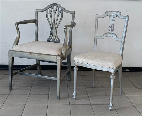 Lotto composto da una poltrona e una sedia in legno verniciato, schienali con c