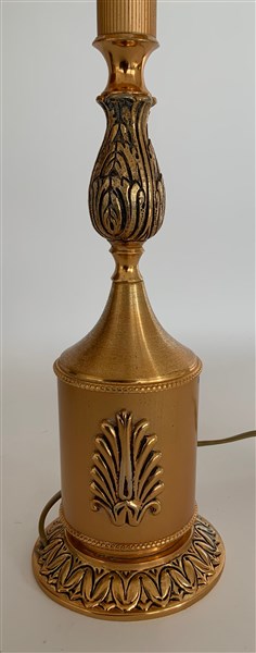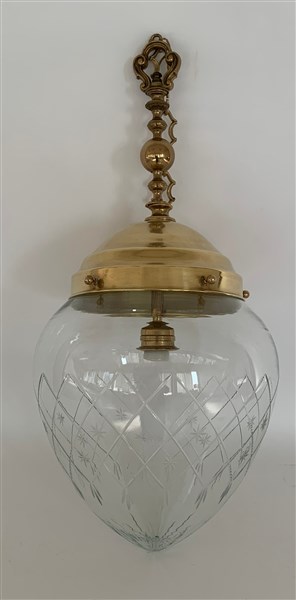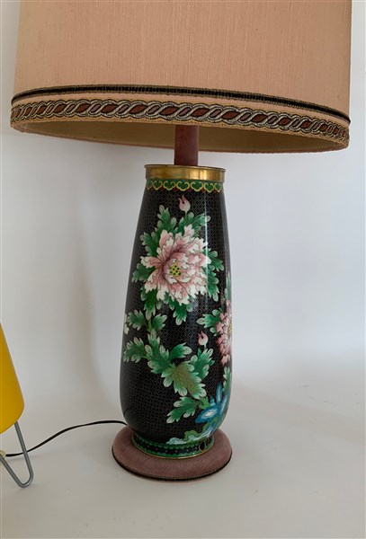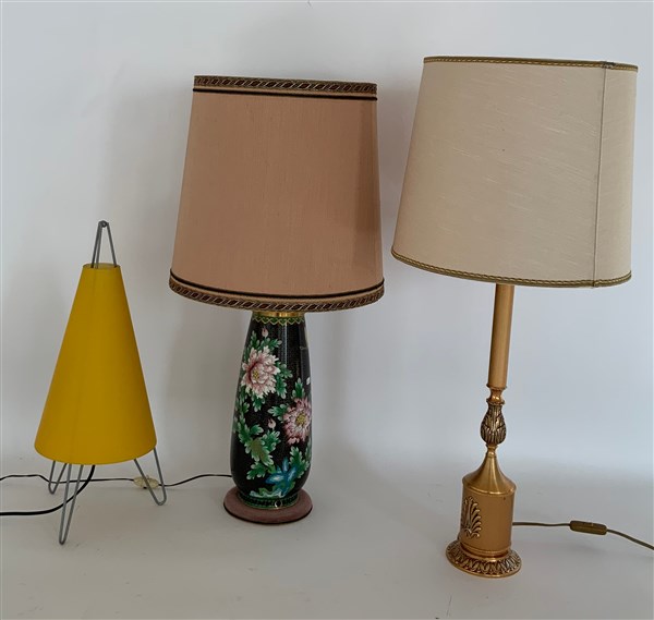Lotto composto da tre diverse lampade da tavolo di cui una con fusto in metallo decorato a smalti cloisonnè, unito ad una lampada a sospensione in ottone con paralume in vetro inciso (h max cm 77) (difetti)