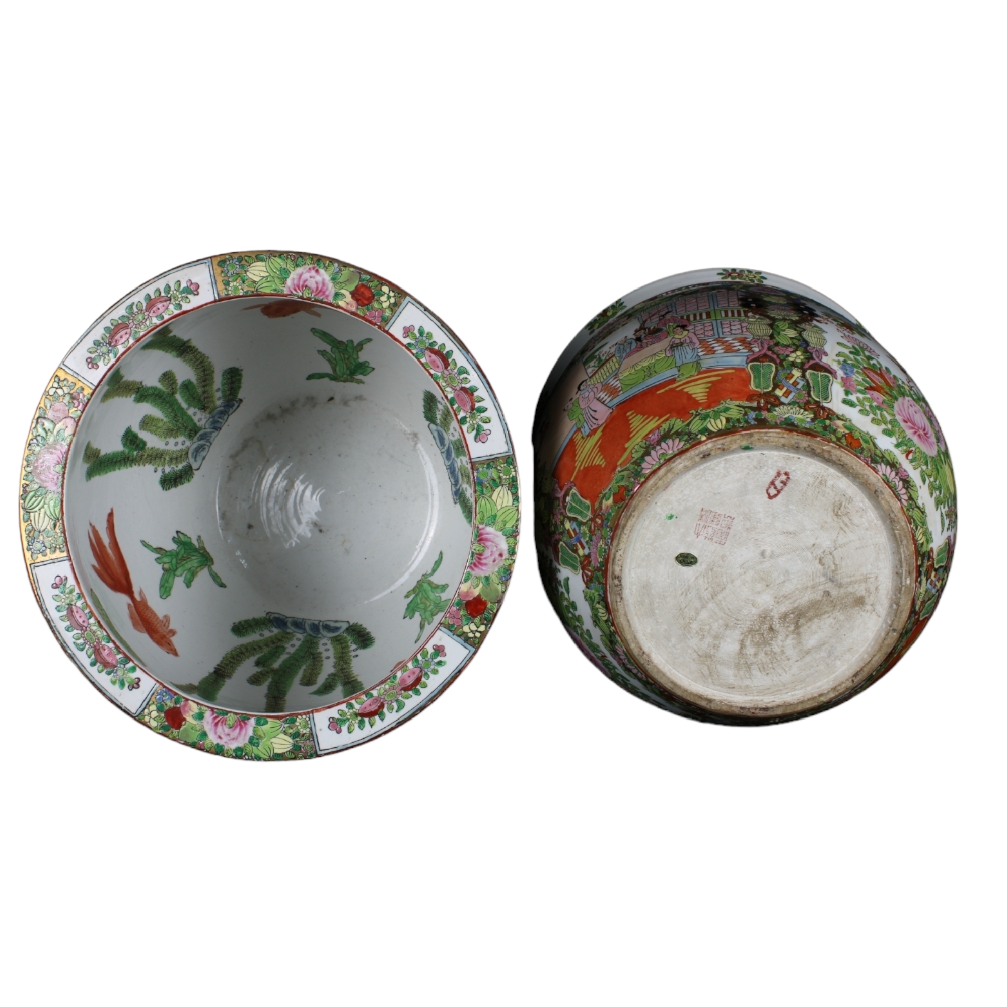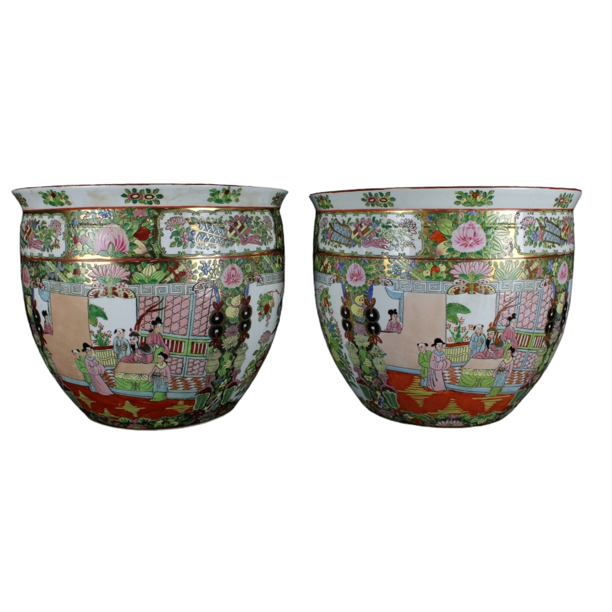 COPPIA DI GRANDI CACHEPOT in porcellana decorata a motivi orientali Cina XX secolo h cm 29,5 x 35,5