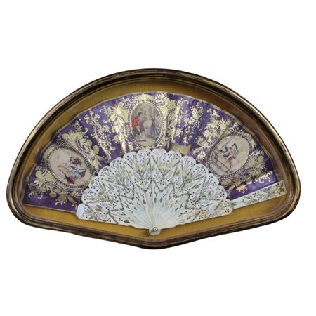 VENTAGLIO con lumeggiature in oro Raff Scene galanti dentro teca manifattura francese XIX secolo h cm 26 x 48 / teca h cm 33 x 54