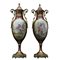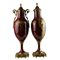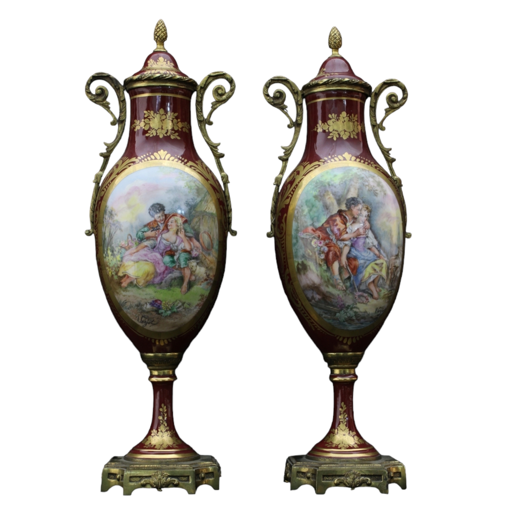 COPPIA VASI in porcellana e bronzo a fondo rosso con lumeggiature in oro dentro riserva raff scene galanti Francia fine XIX secolo h cm 41 x 11