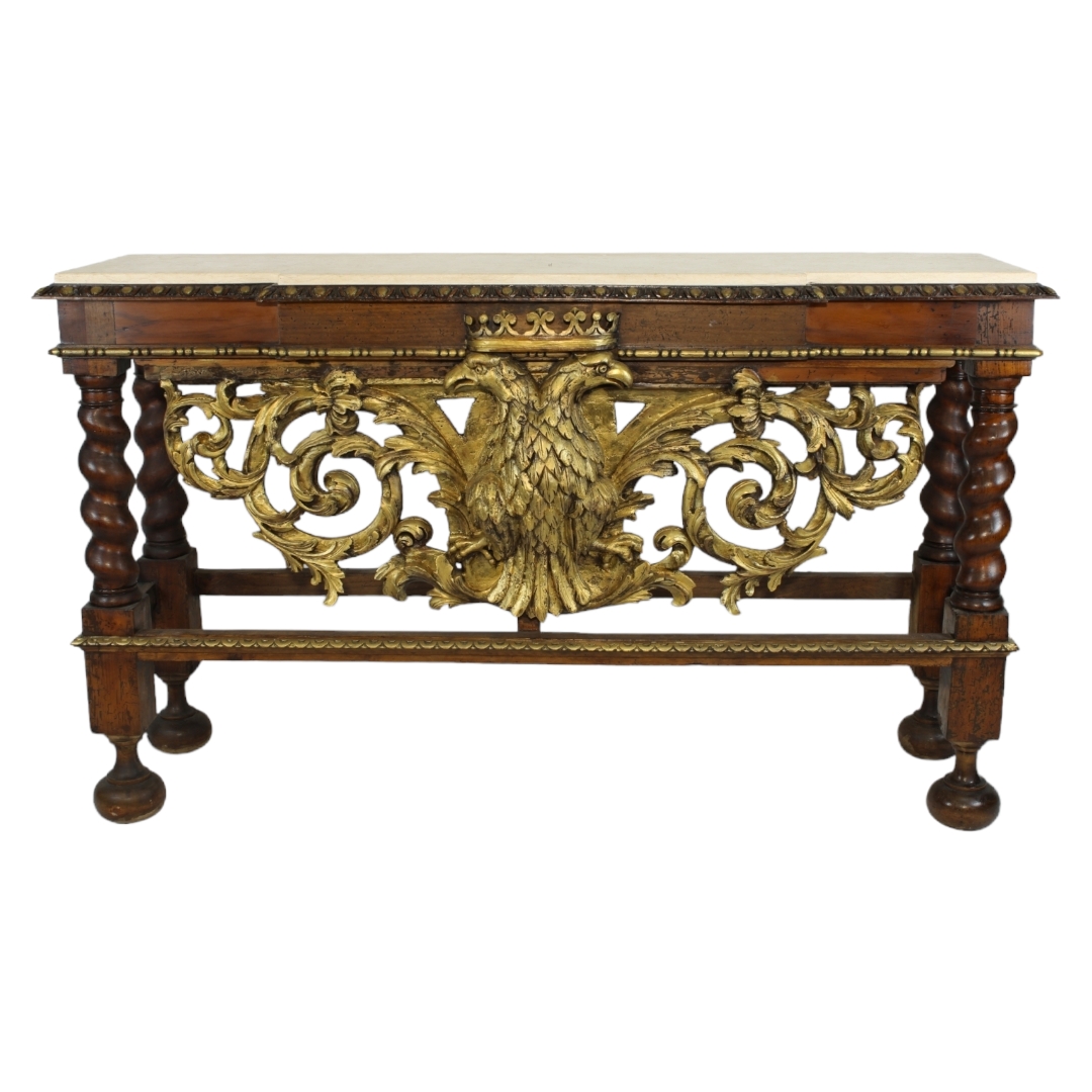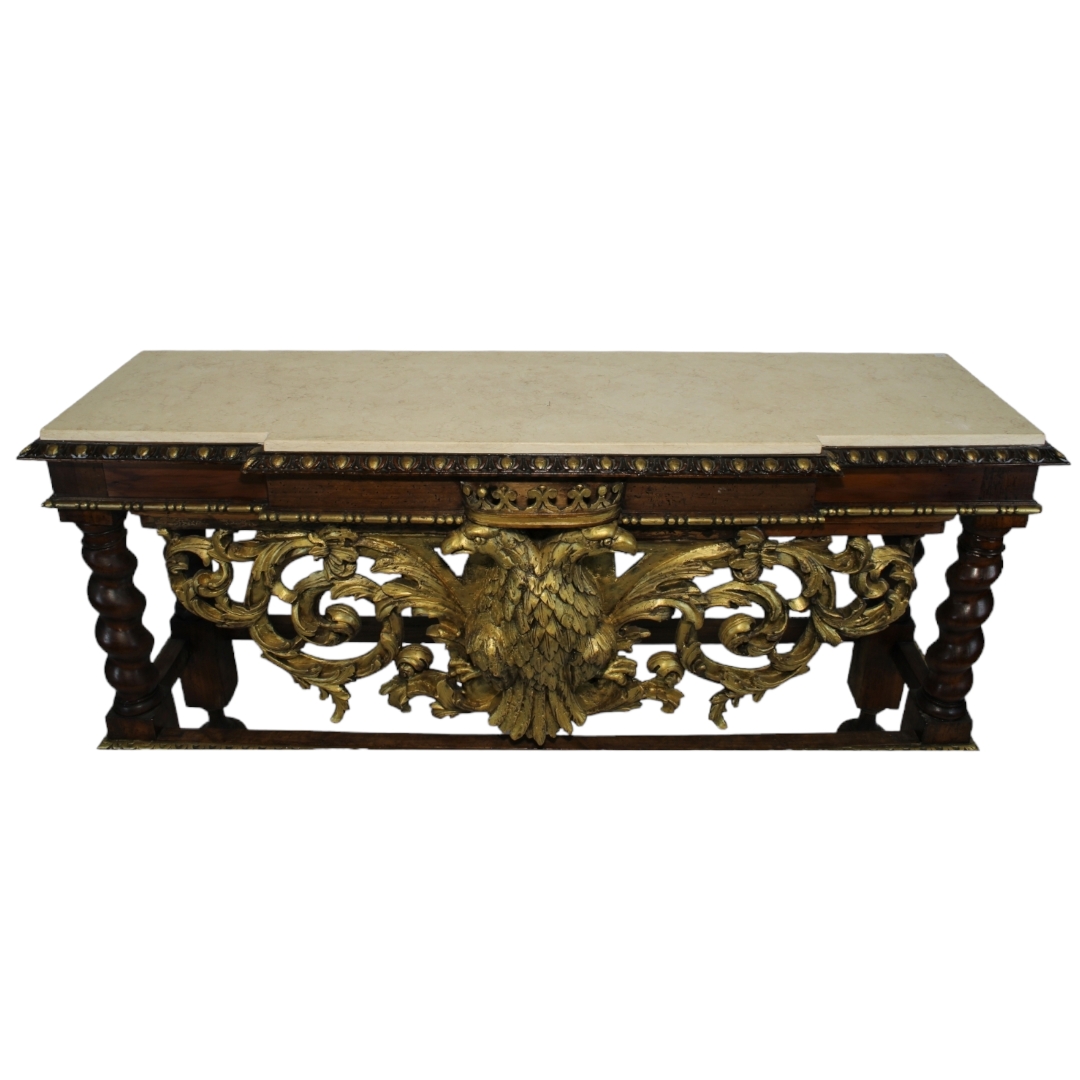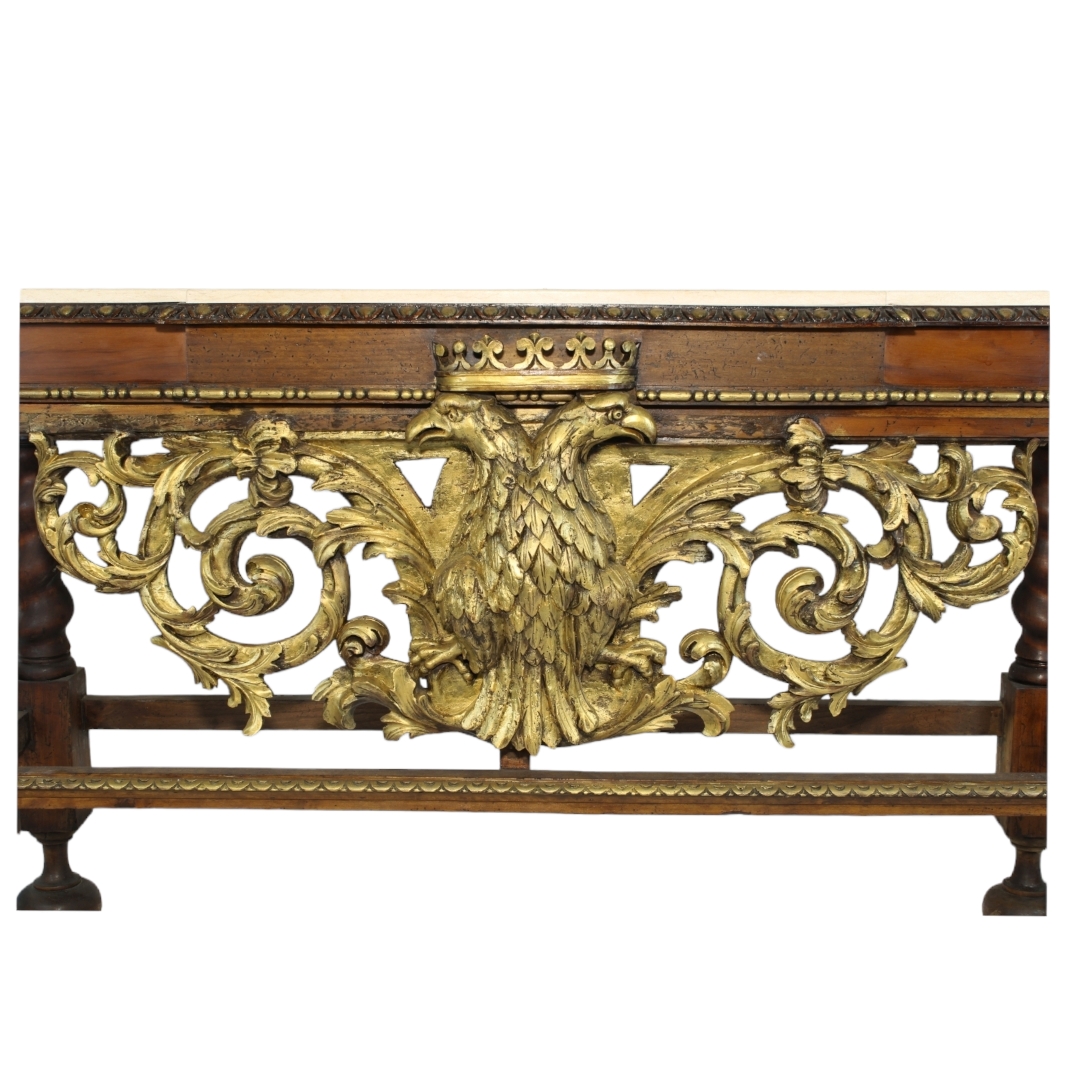 TAVOLO DA MURO IN LEGNO DI NOCE riccamente scolpito e dorato arricchito da intaglio raff aquile coronate, piano in marmo giallo Sicilia XIX / XX secolo h cm 100 x 166 x 46
