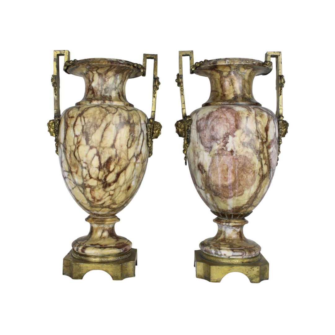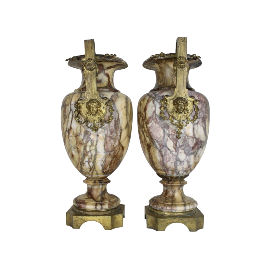 COPPIA DI VASI in marmo fior di pesco con manici e base in bronzo dorato Italia XIX secolo h cm 40 x 21