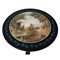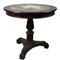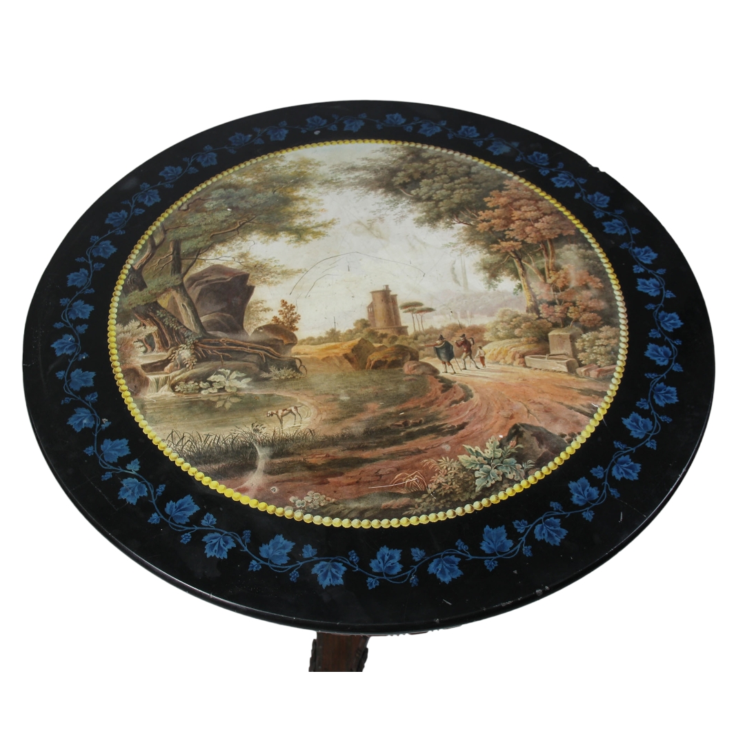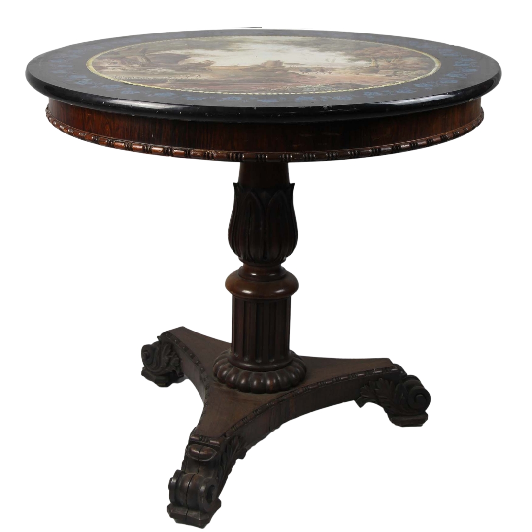 TAVOLINO CON PIANO IN SCAGLIOLA piano in scagliola raffigurante paesaggio alberato con viandanti incorniciato da ramage fogliaceo e bordo nero attribuibile a Pietro della Valle (Livorno 1819- Firenze 1880) tavolino tondo in palissandro con fusto centrale di forma cilindrica scanalato ed intagliato. Firenze primi XIX sec. il bordo nero con ramage fogliaceo incornicia un paesaggio alberato da viandanti 1810 Firenze h cm 72 x Ø 83