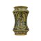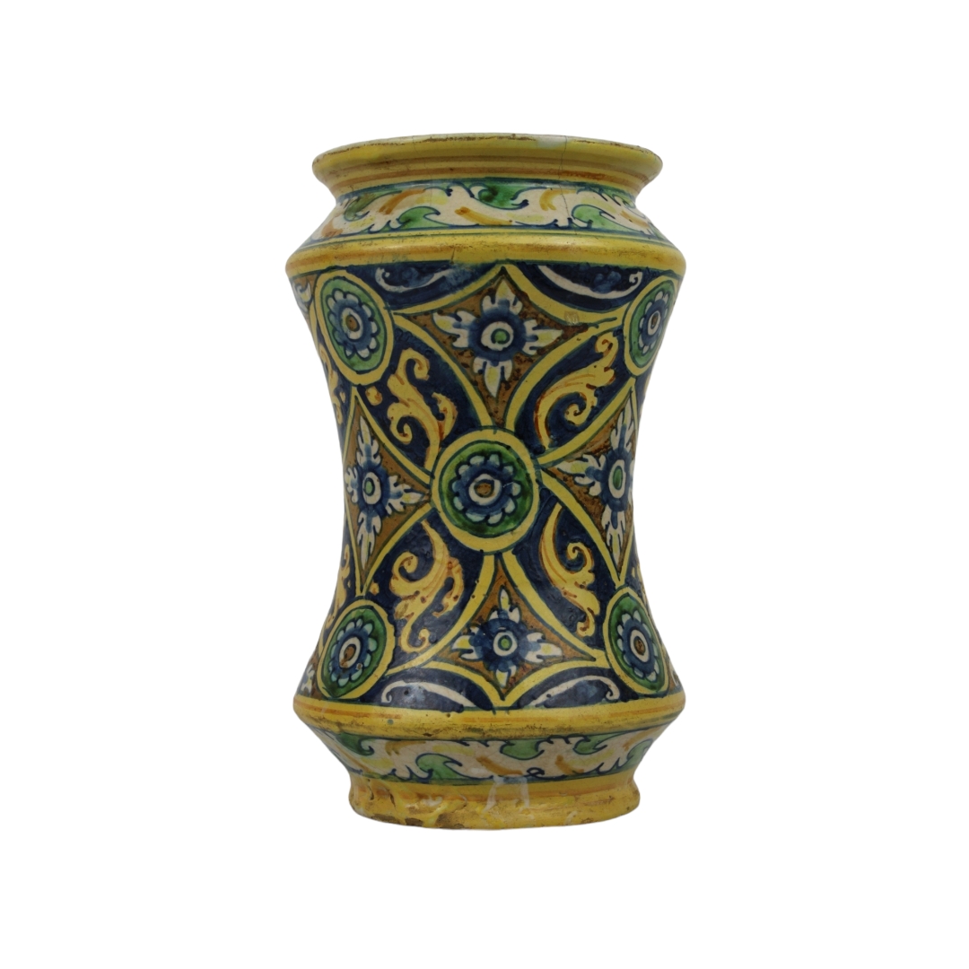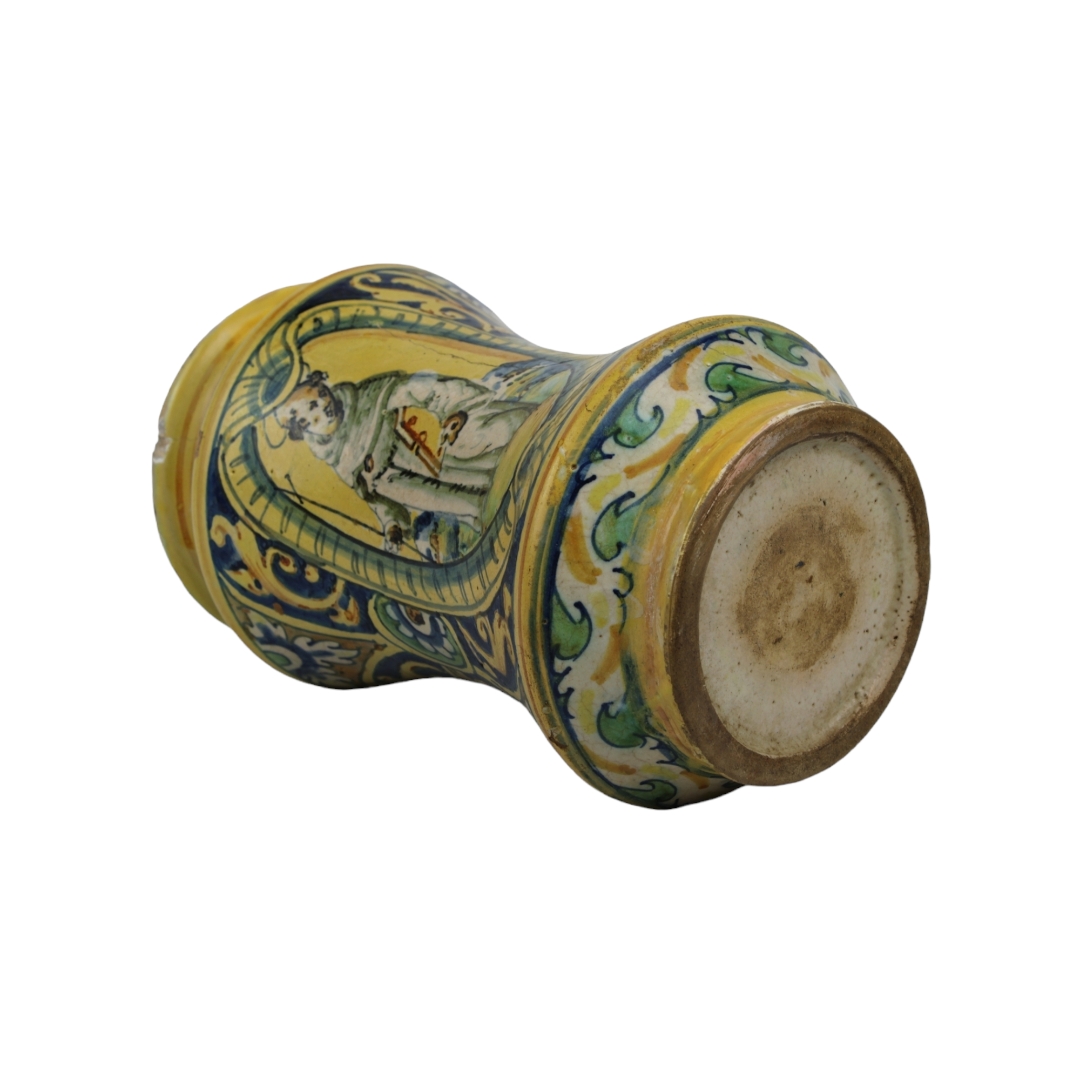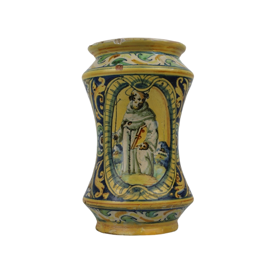 ALBARELLO in maiolica policroma decorato a tutto tondo dentro riserva figura di Santo attribuibile al maestro Andrea Pantaleo Palermo XVII secolo h cm 19,5 x 12