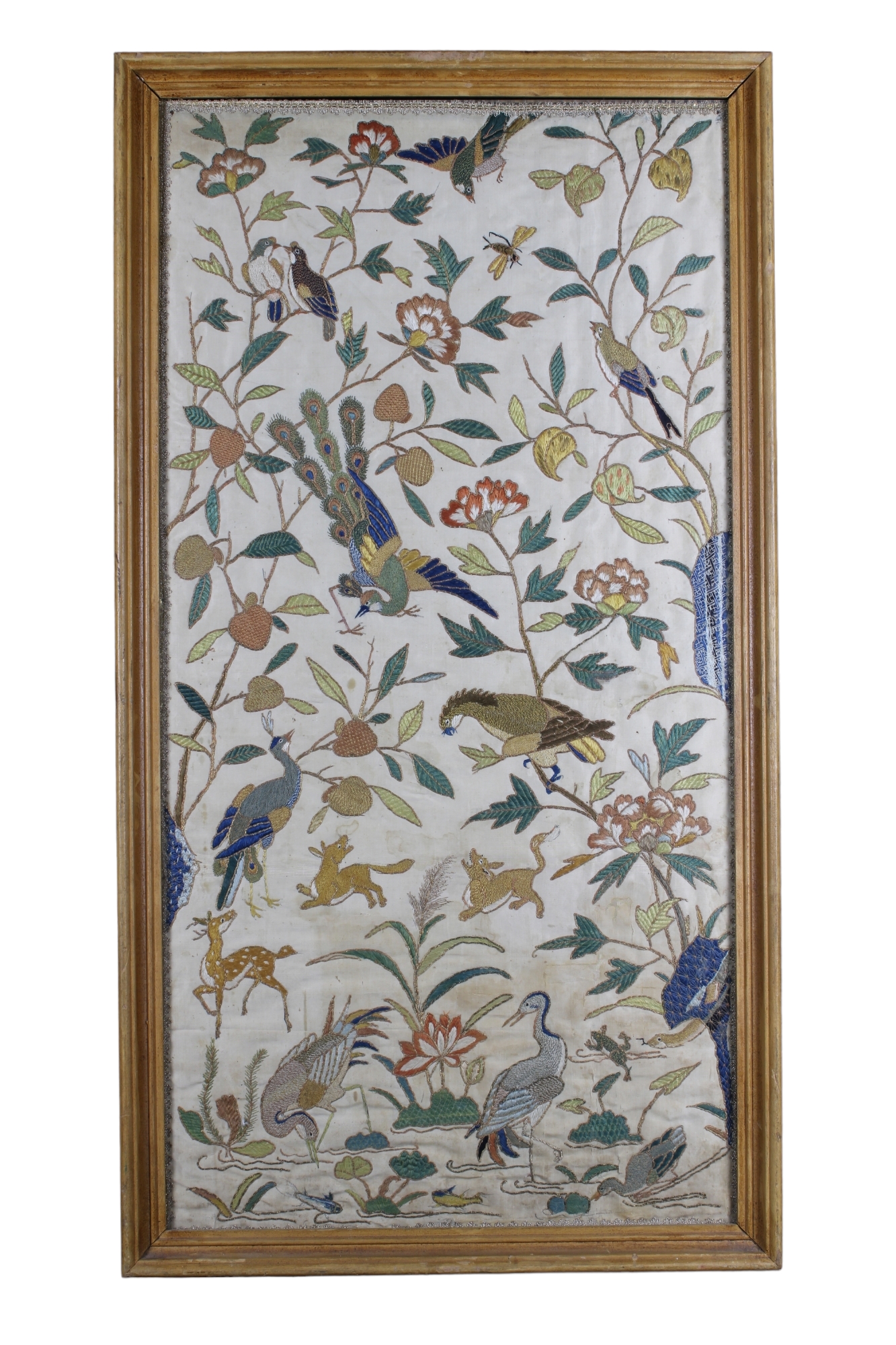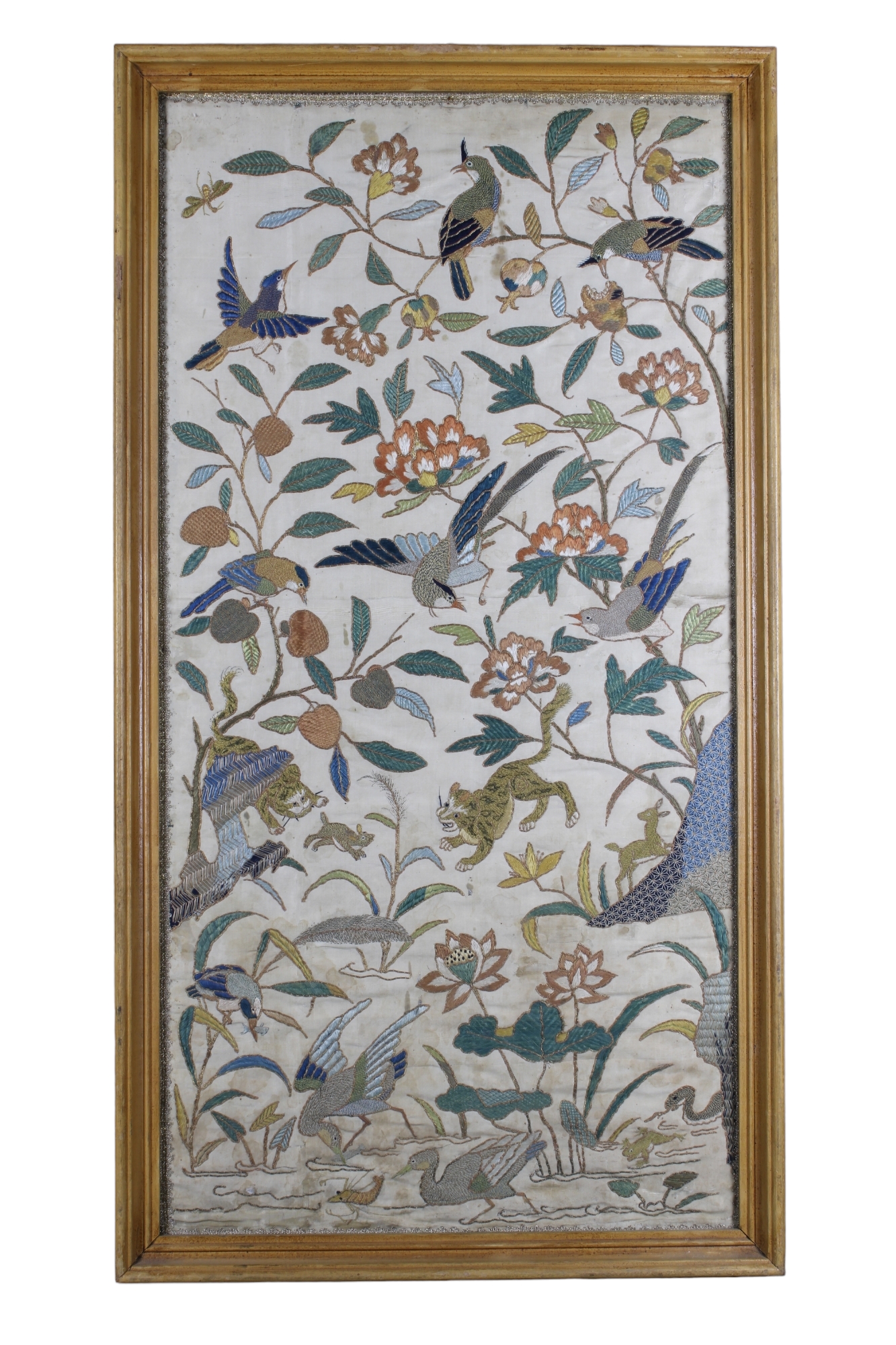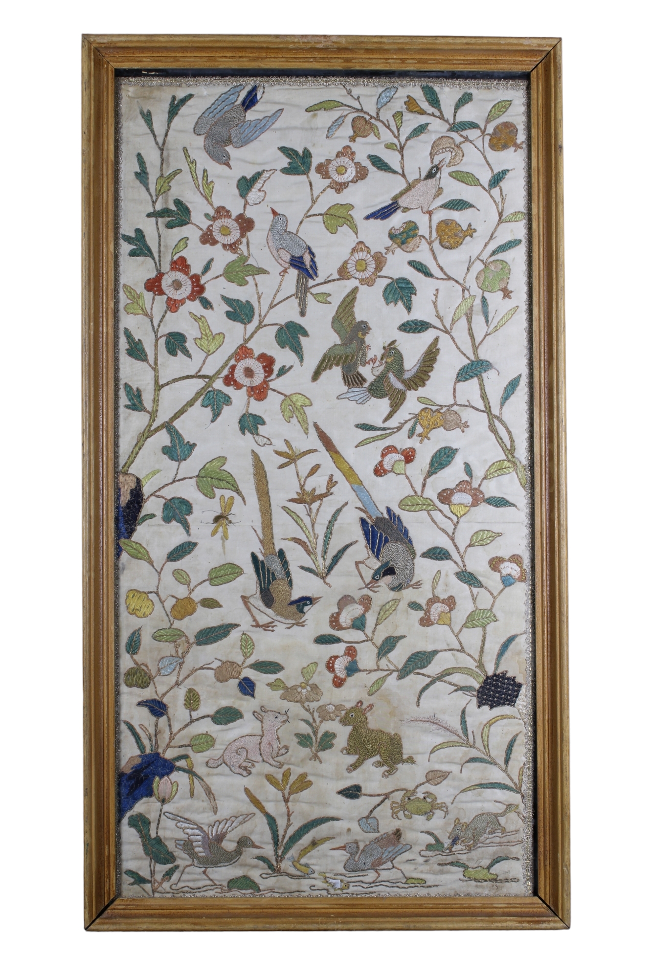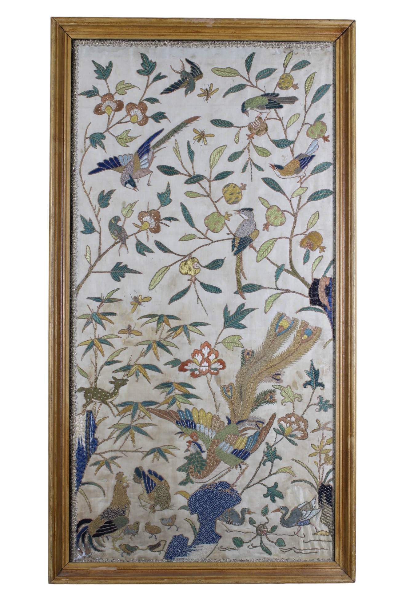 4 PANNELLI in seta ricamata a motivi di flora e fauna manifattura orientale XVIII secolo h cm 89 x 48