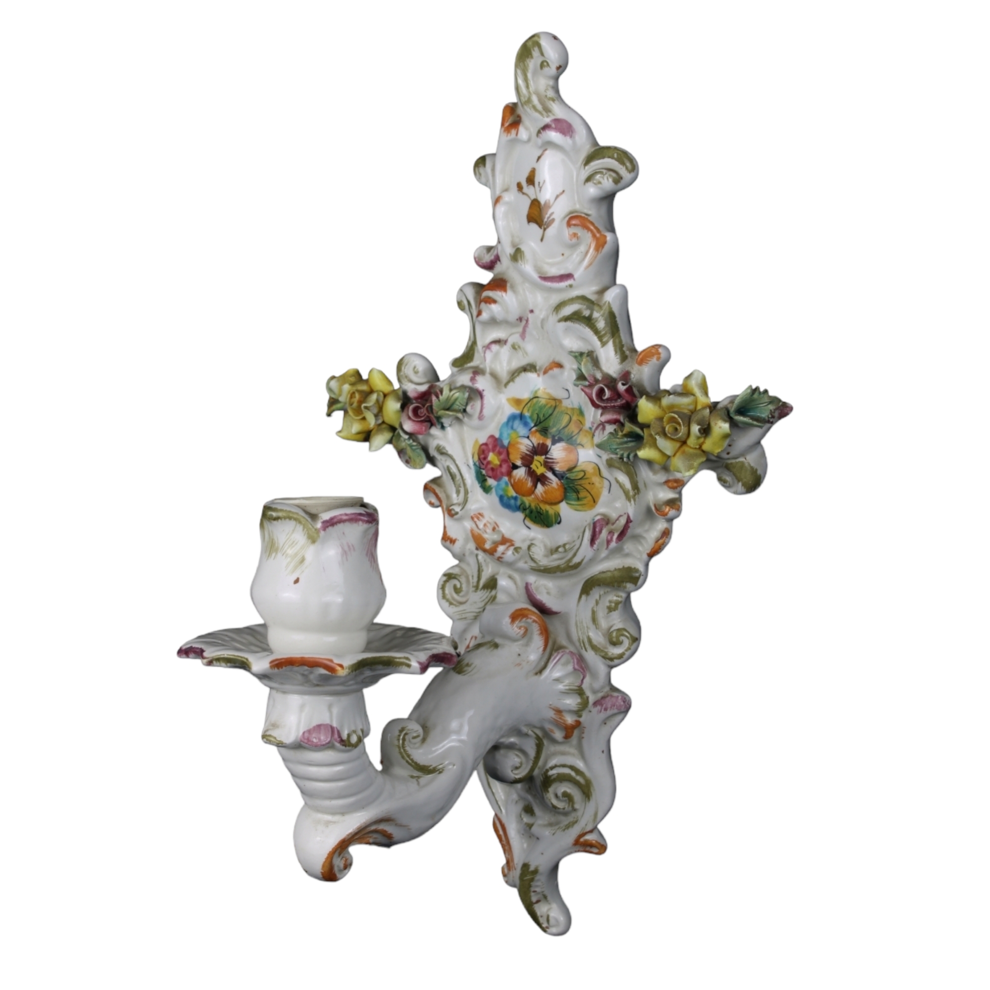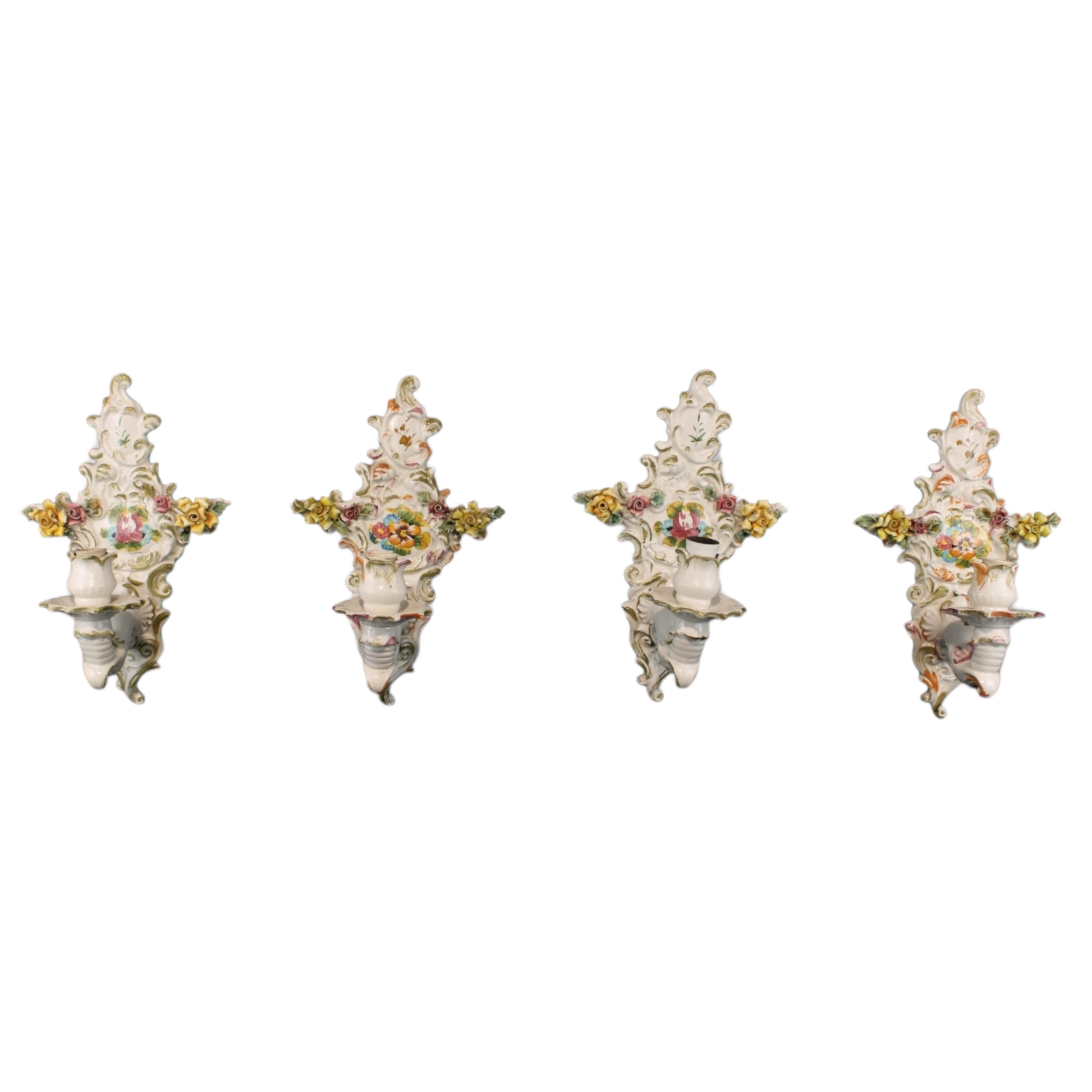 LOTTO DI 4 APPLIQUES AD UNA FIAMMA in ceramica policroma manifattura Bassano XX secolo h cm 33 x 21 x 19