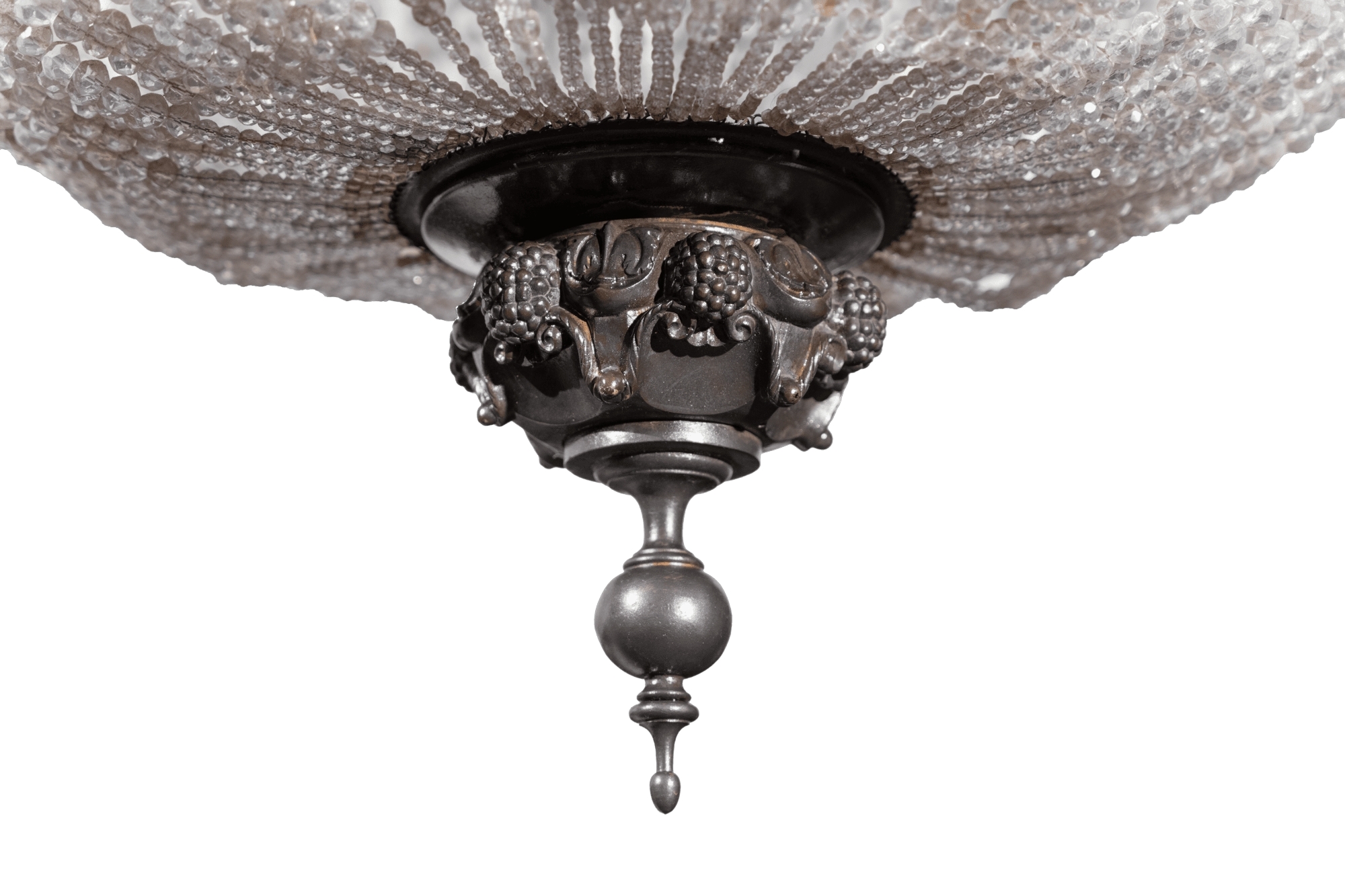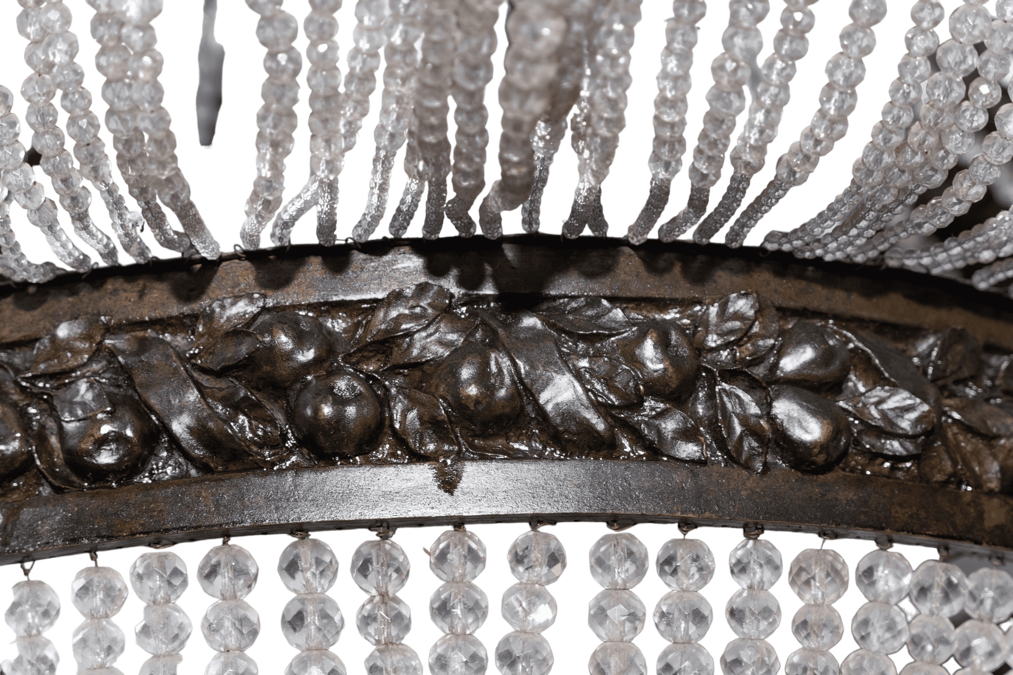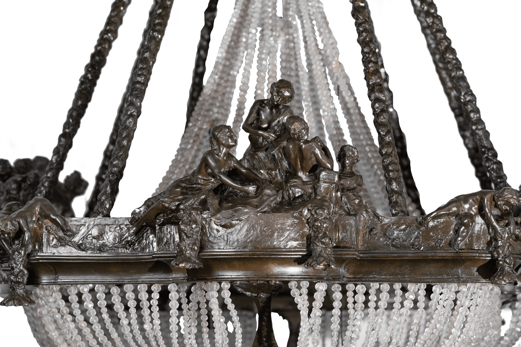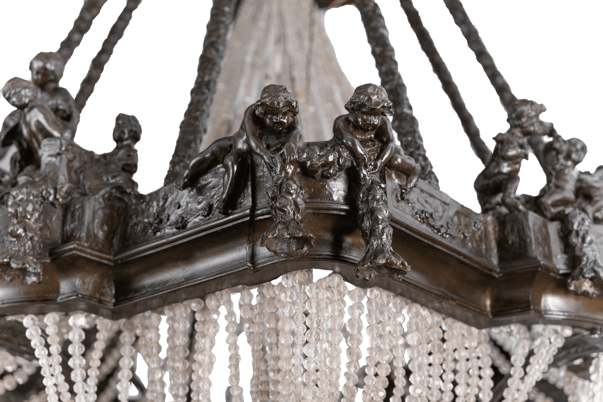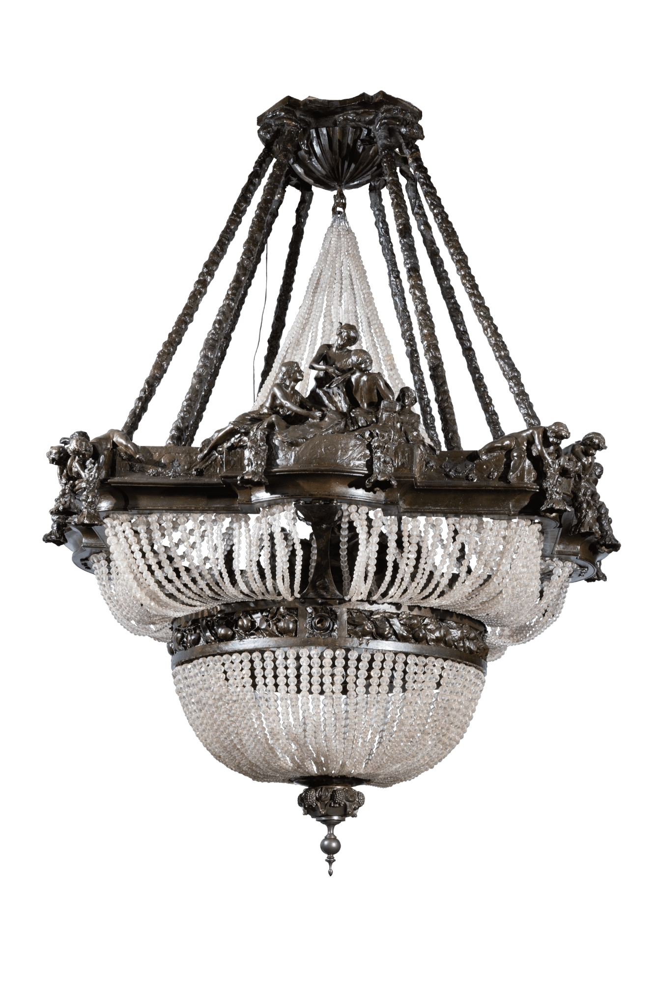 IMPORTANTE MONUMENTALE LAMPADARIO in fusione di ghisa, si sviluppa a 2 livelli sostenuti da barre decorate raccordate in alto da piastra sagomata, la parte centrale di forma articolata è decorata da una serie di putti ludici il livello sottostante a forma di cesto presenta un cerchio arricchiro da sculture di fiori e frutti raccordato a quello centrale dafili di sfere in vetro sfaccettato e termina con un rosone decorato e pinnacolo la fusione probabilmente francese è databile tra la fine dell'800 ed i primi del 900 h cm 220 x 150