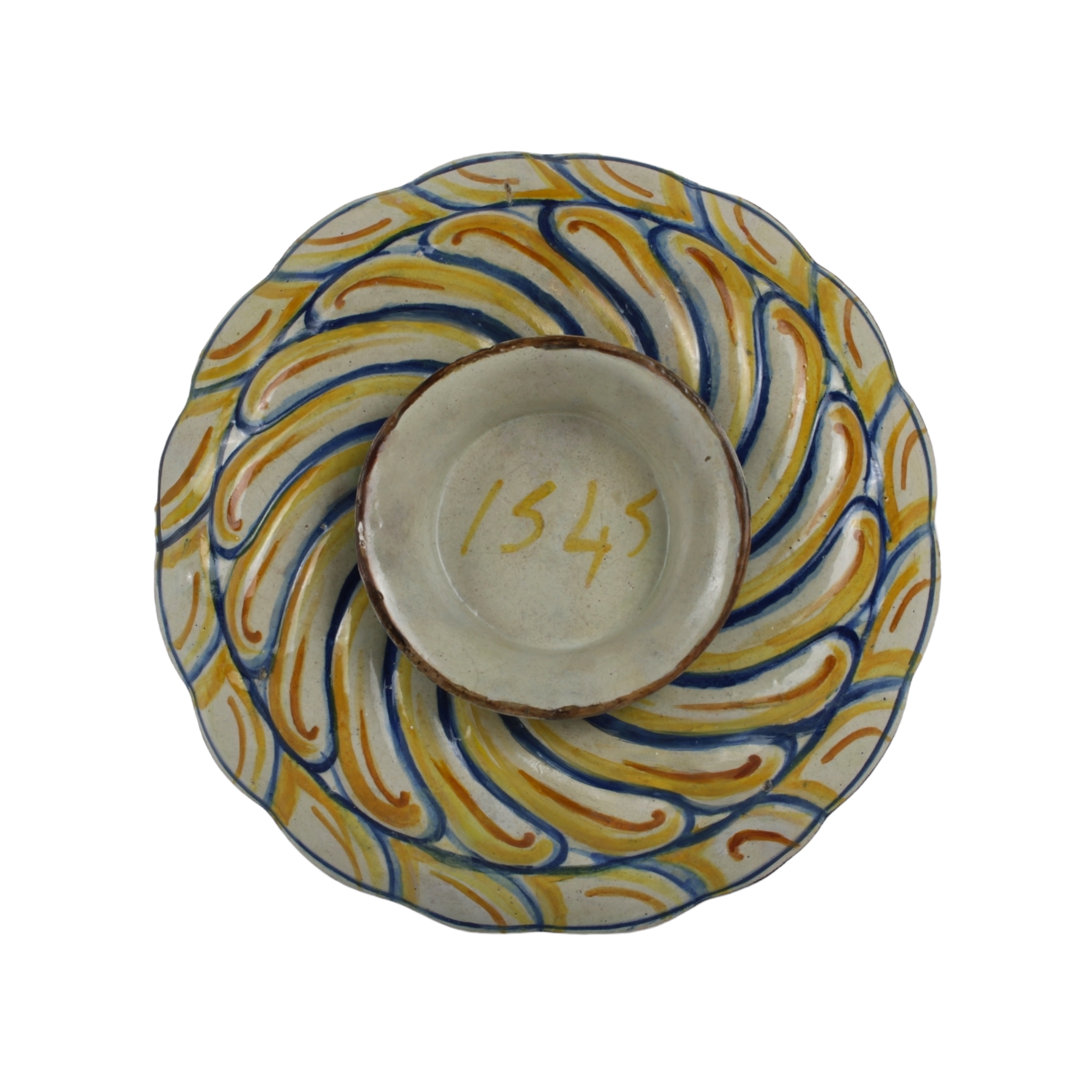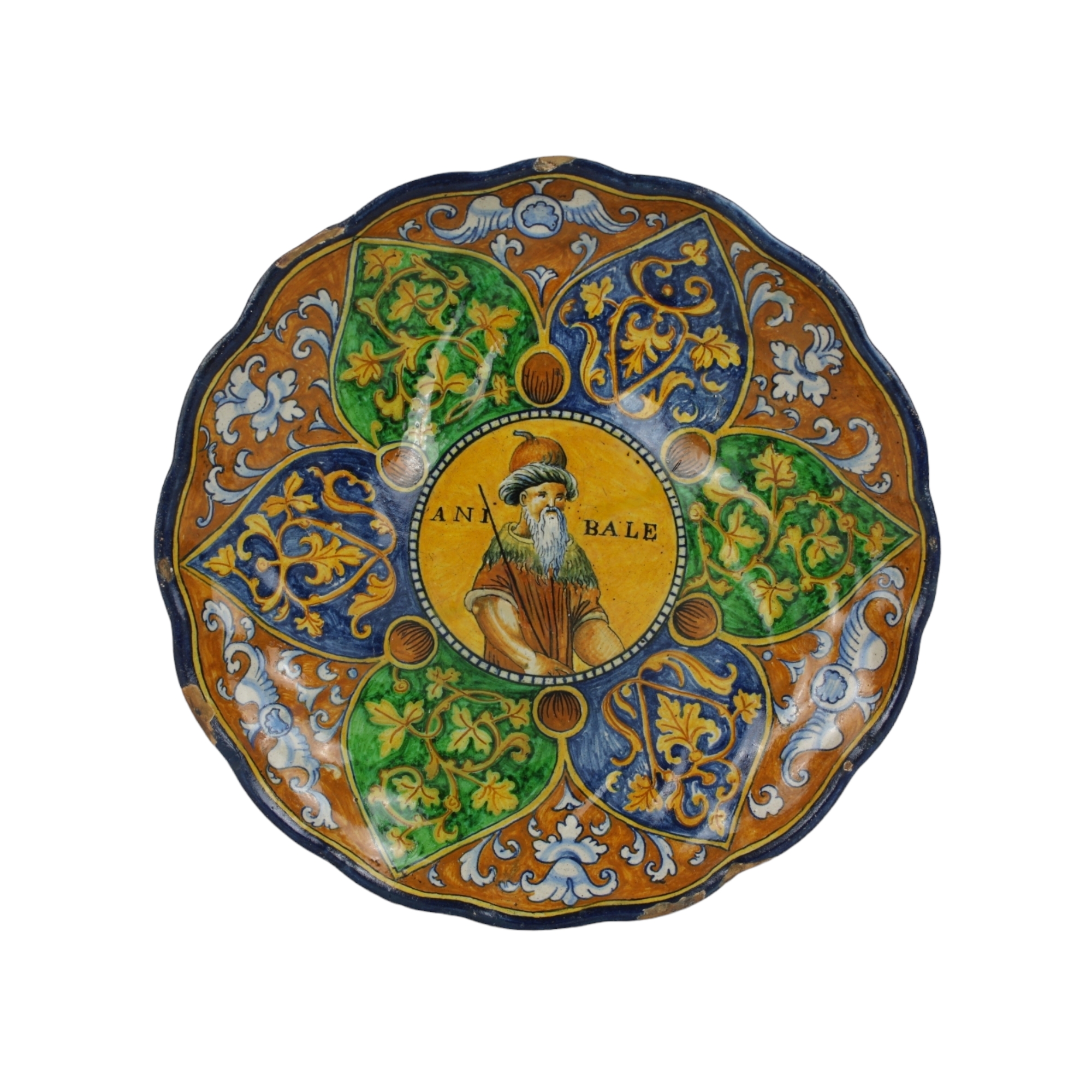 IMPORTANTE CRESPINA in maiolica policroma finemente dipinta dentro riserva figura e scritta Annibale reca data 1545 Deruta h cm 4,5 x 23,5