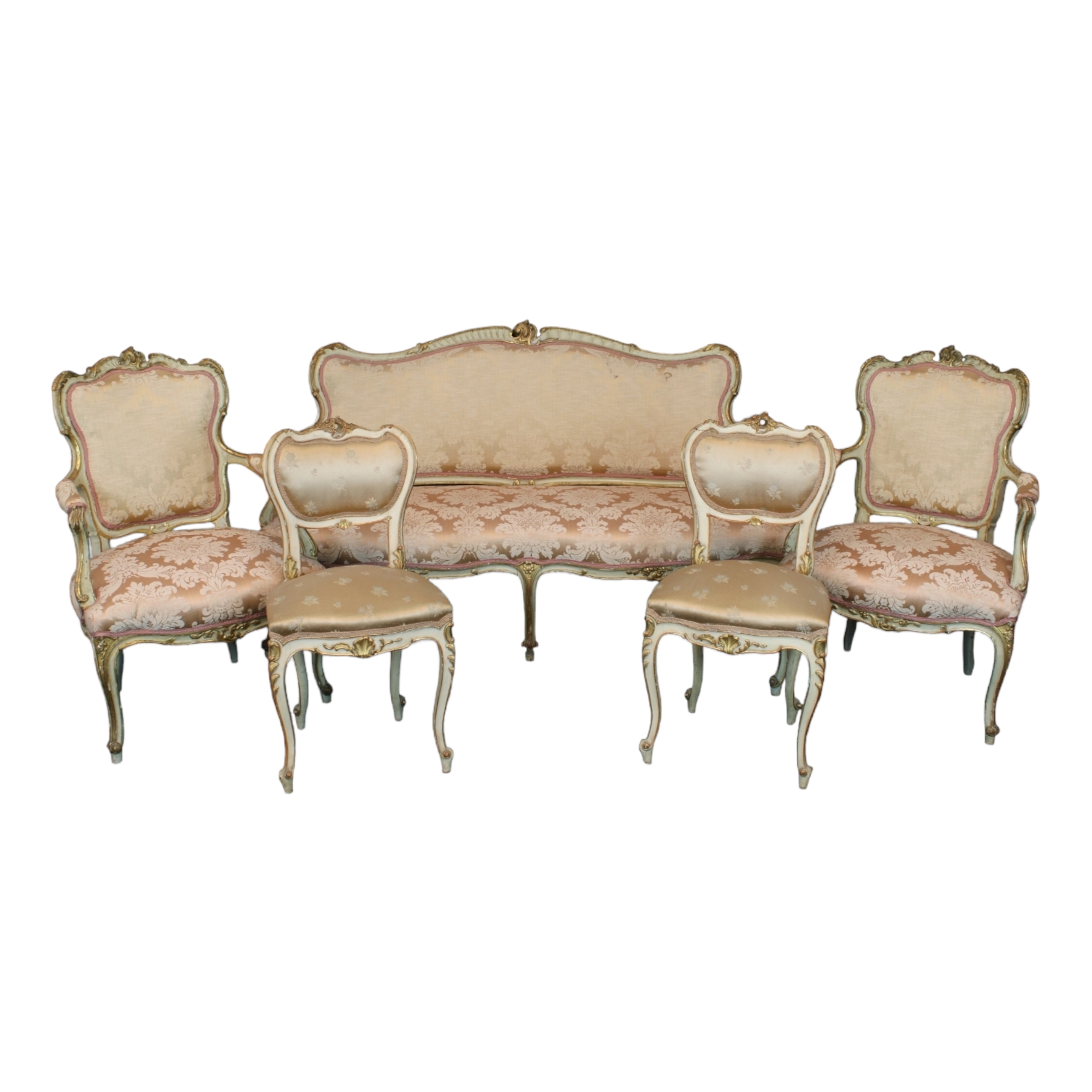 SALOTTO COMPOSTA DA: Divano, 2 poltrone e 2 sedie in legno laccato e dorato di gusto settecentesco Sicilia XIX secolo h cm 95 x 160 x 80 / h cm 95 x 63 x 70 h cm 82 x 43 x 47