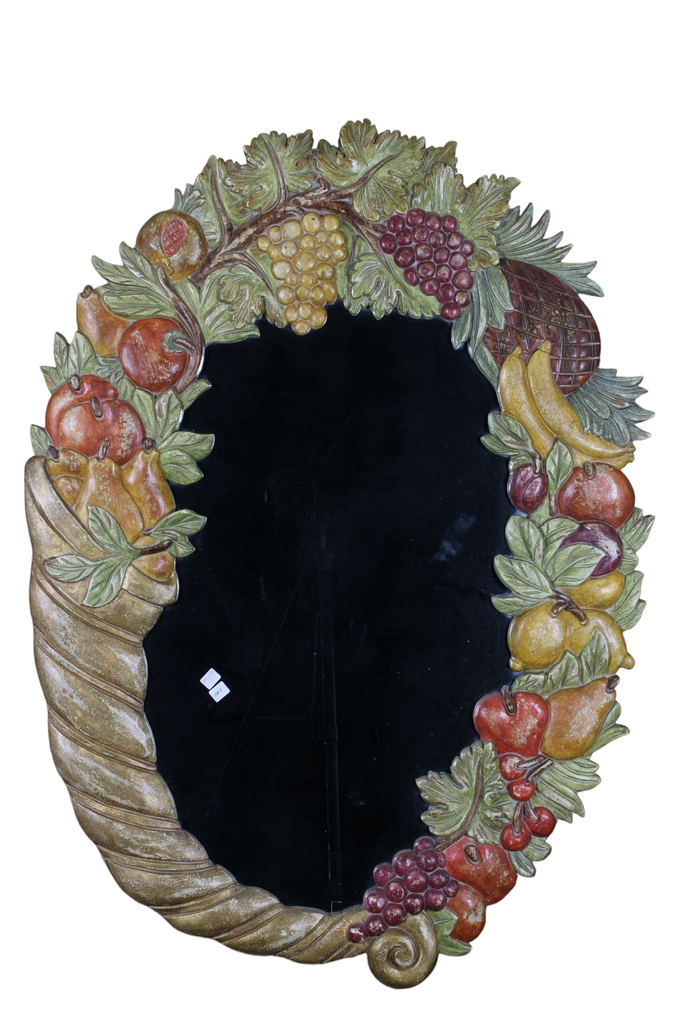CURIOSA SPECCHIERA in legno scolpito a formare cornucopia con frutta manifattura italiana XX secolo h cm 106 x 80