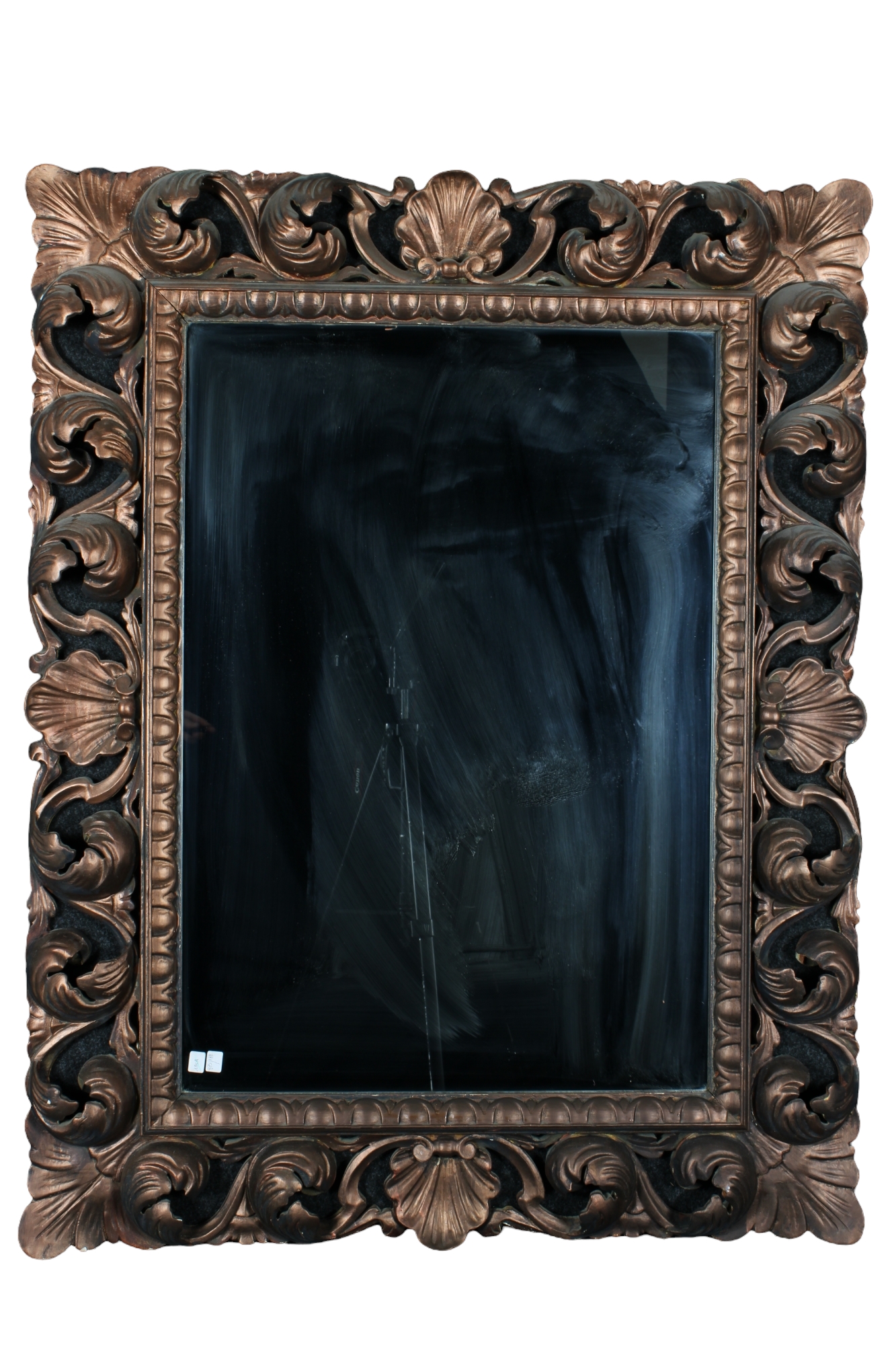 CORNICE A CARTOCCIO in legno riccamente intagliato e dipinta a finto bronzo manifattura italiana XX secolo h cm 121 x 95