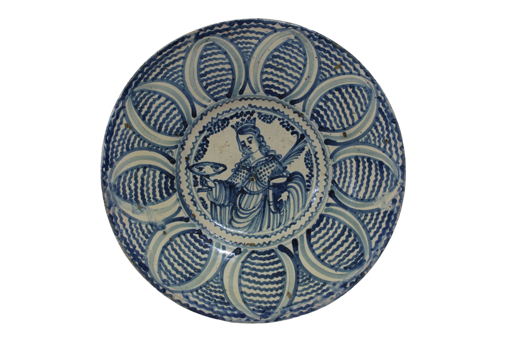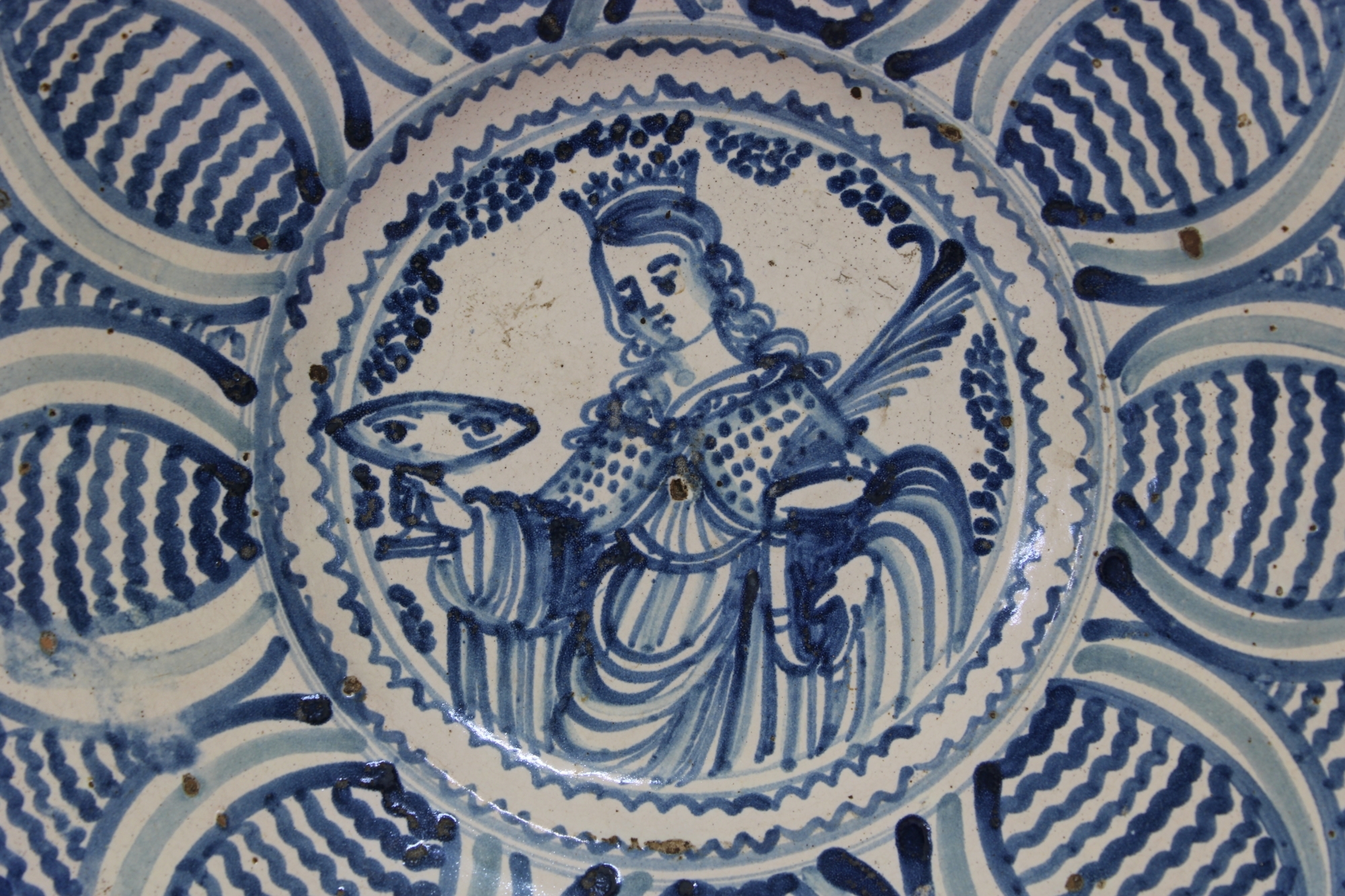 IMPORTANTE PIATTO IN MAIOLICA a fondo bianco e dipinto nei toni del blu raff Santa Lucia Caltagirone 1620/1630 circa cm Ø 33,5