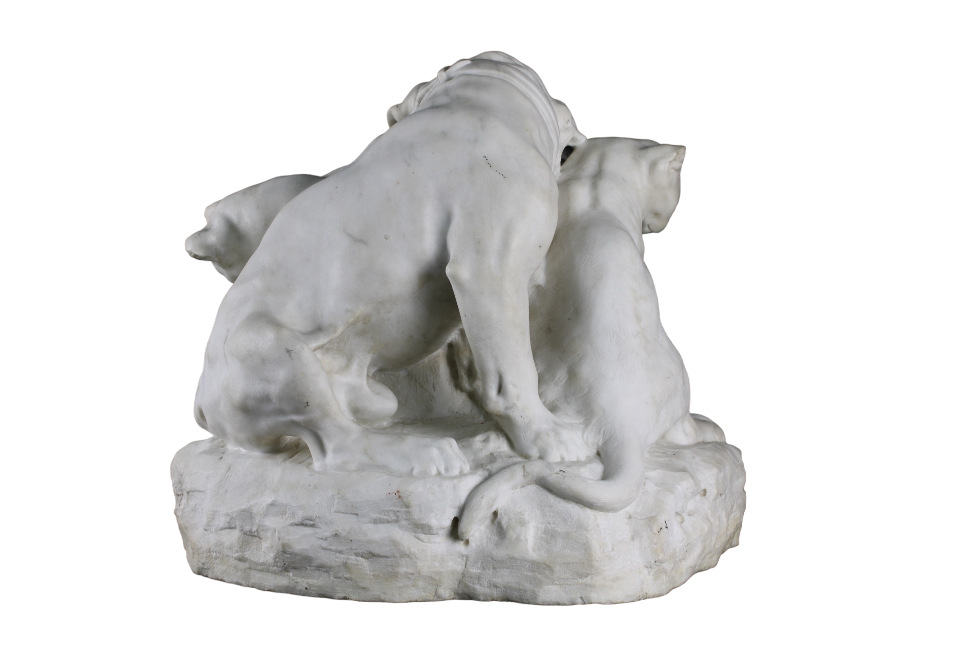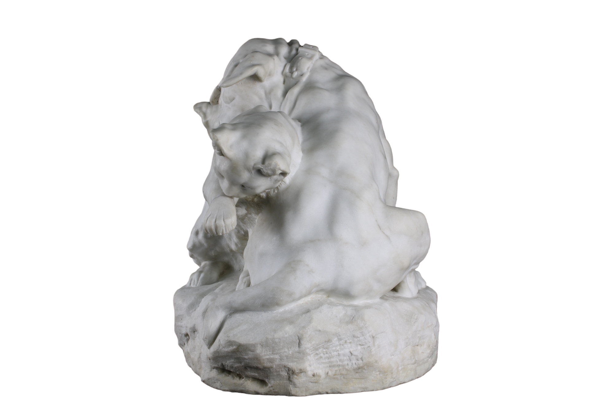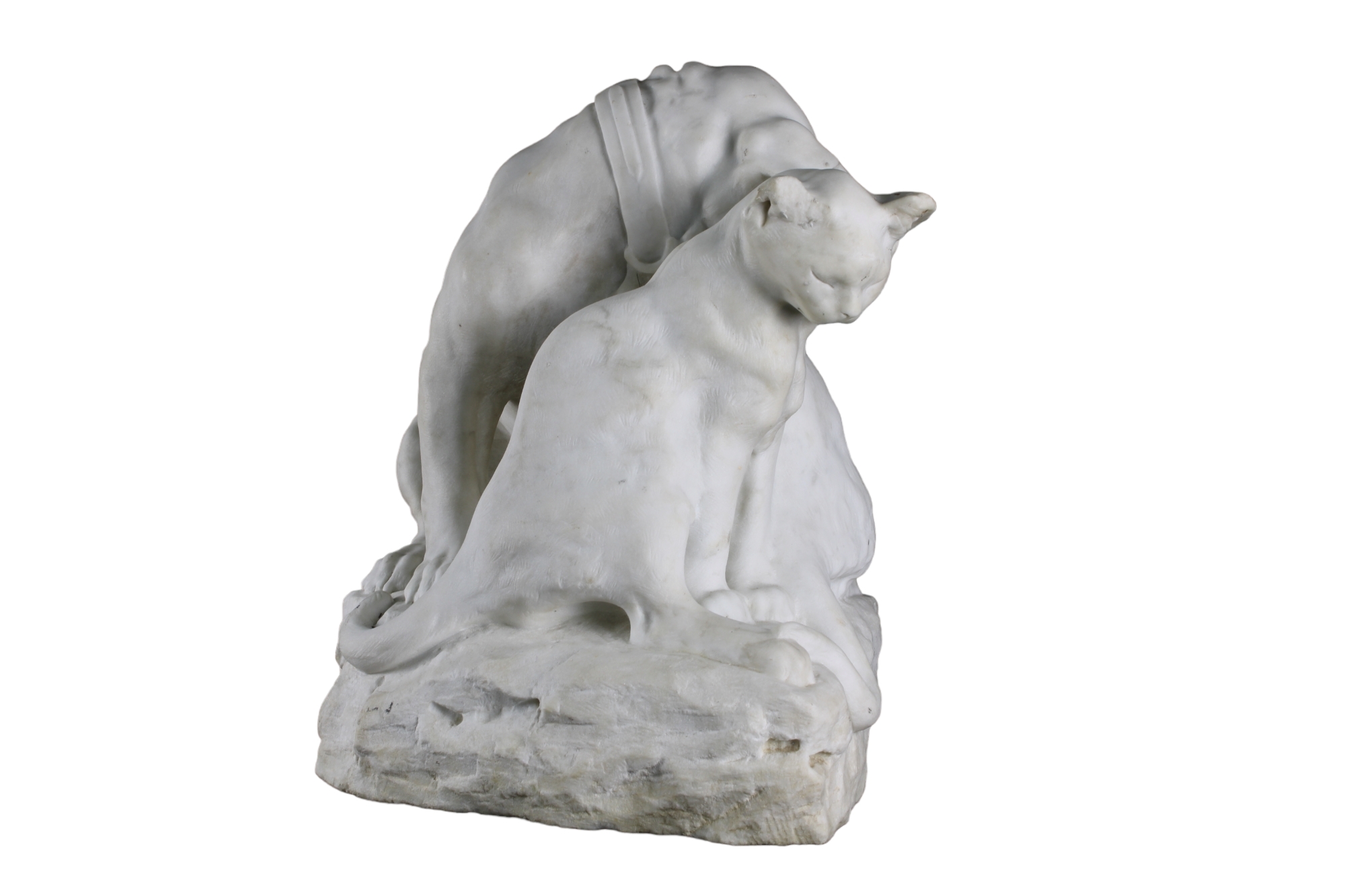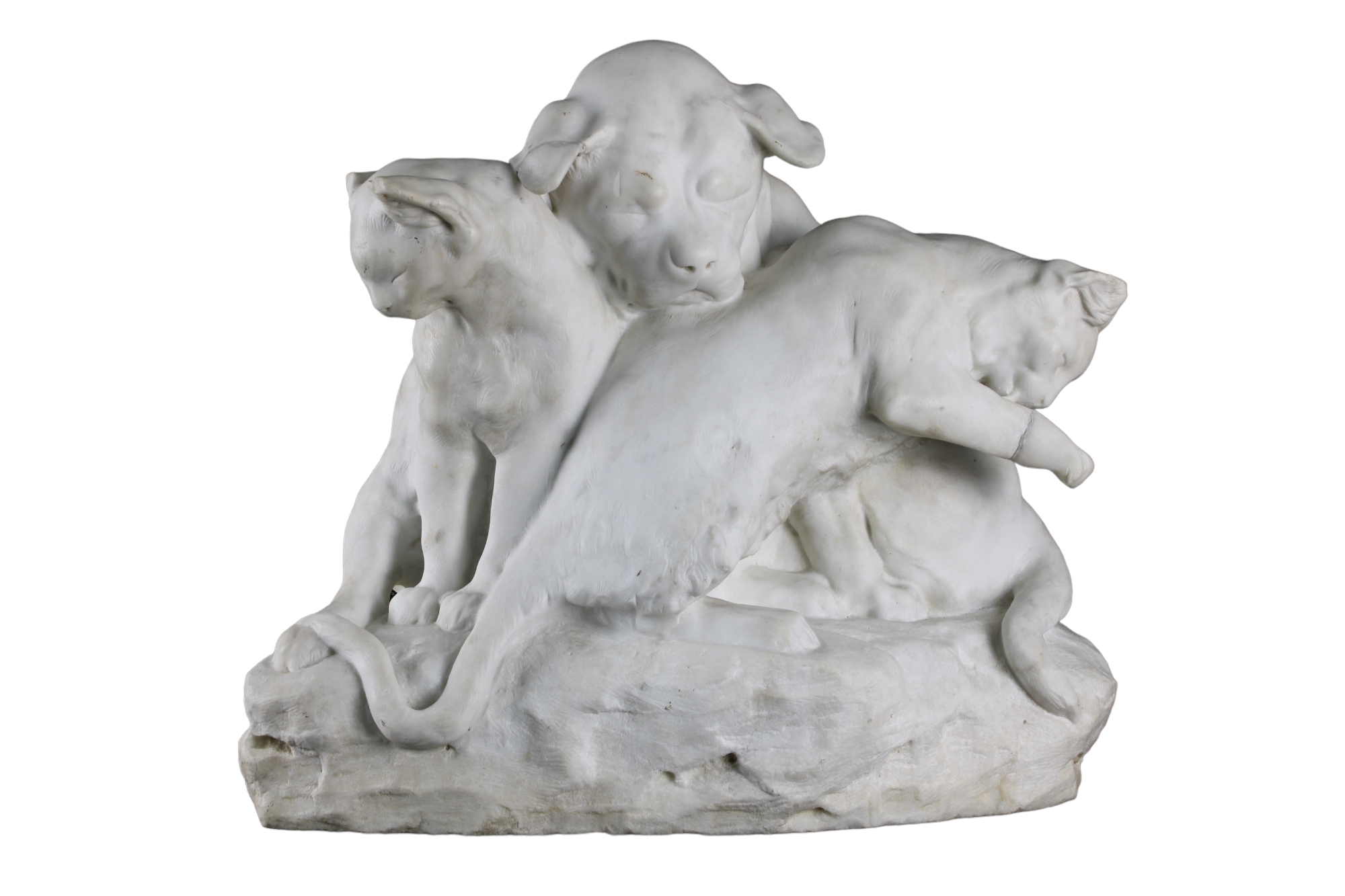 GRUPPO SCULTOREO finemente scolpito in marmo bianco di Carrara Raff Cane e gatti maestranze italiane XIX secolo incollagi e usure del tempo h cm 38 x 41 x 25