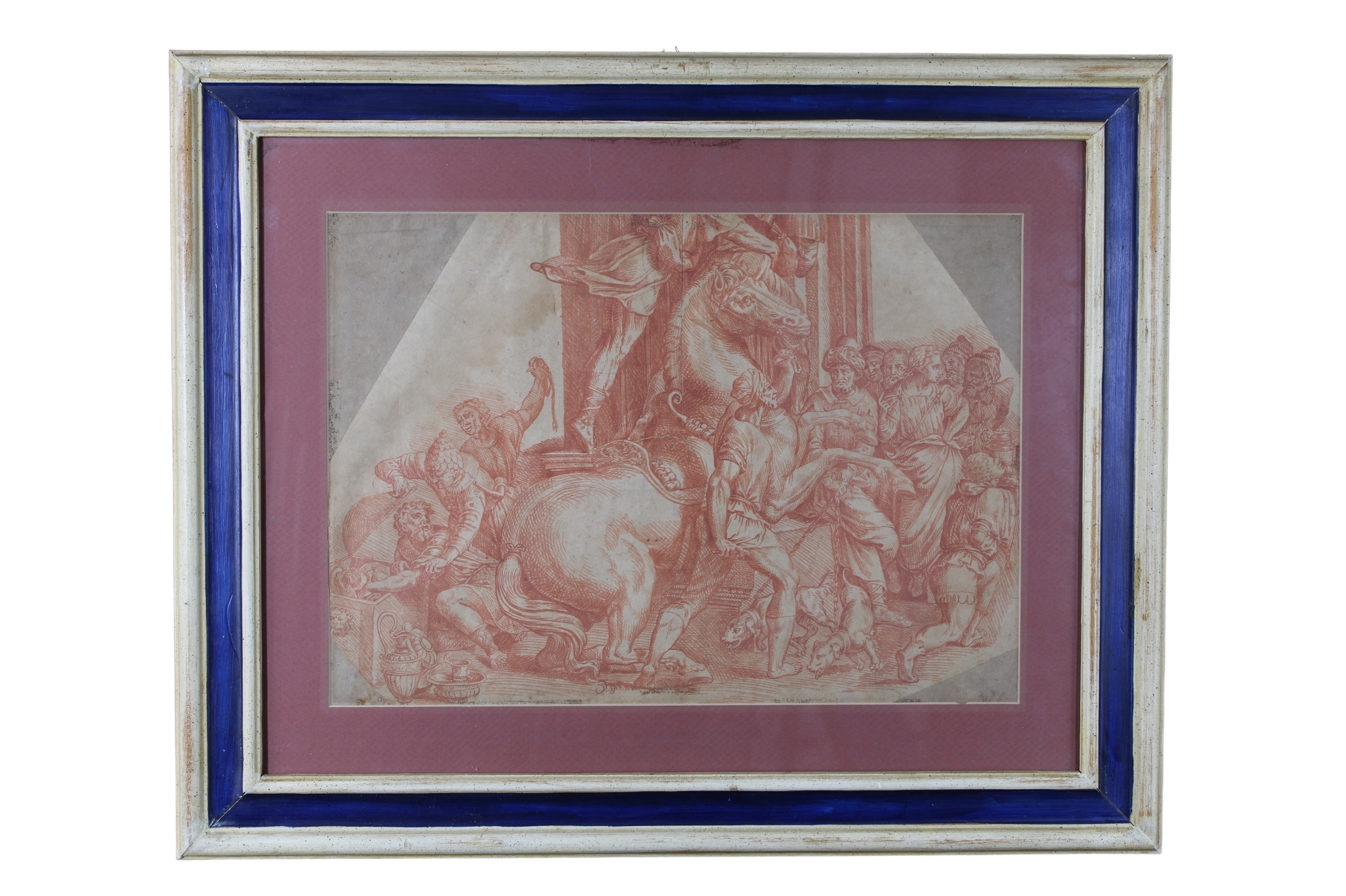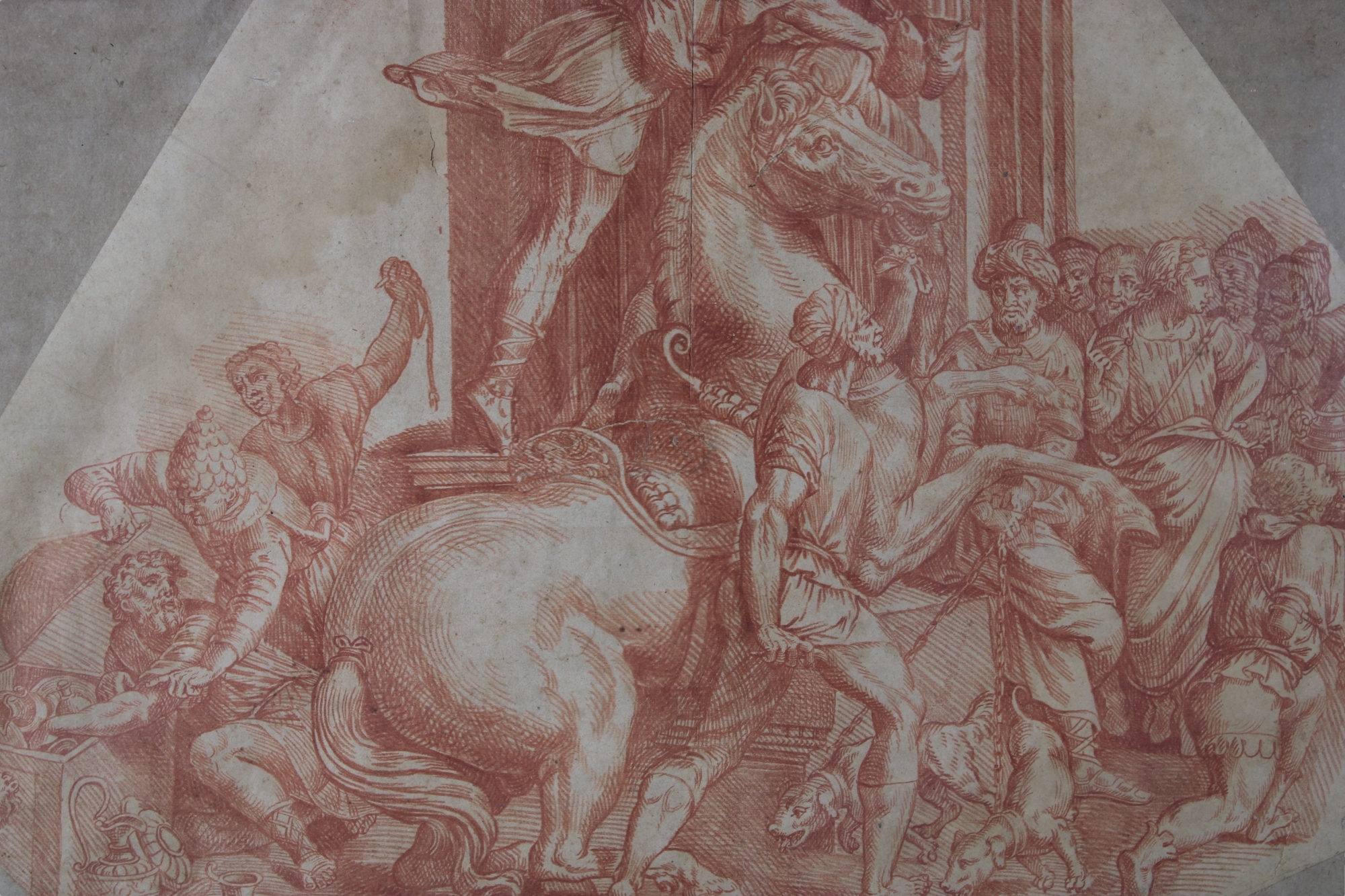 DISEGNO RINASCIMENTALE A SANGUIGNA Raff Cavallo imbizzarrito con personaggi XVI/XVII secolo Italia h cm 31 x 44