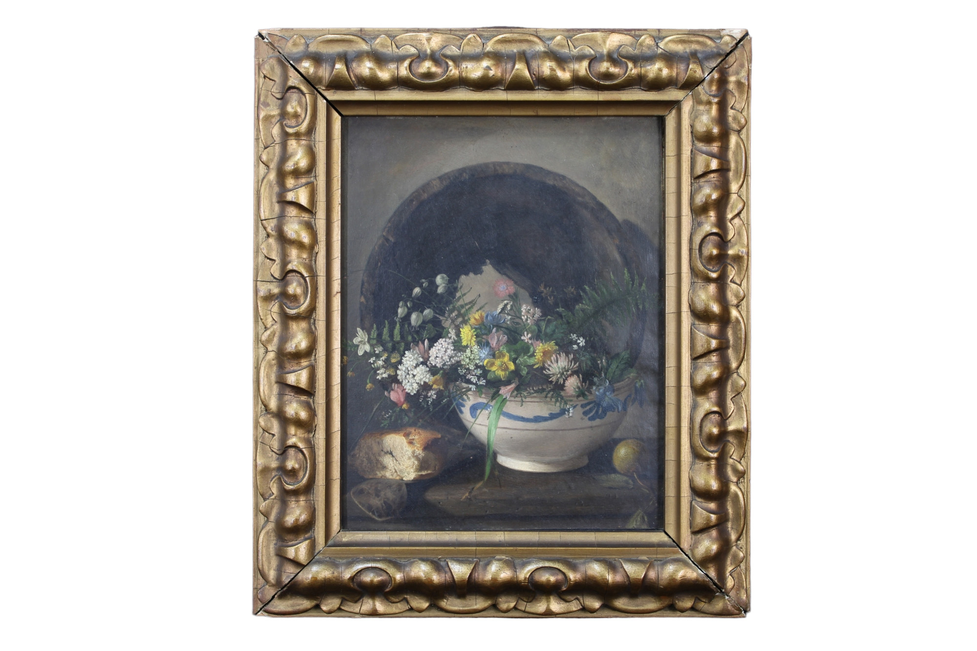 OLIO SU CARTONCINO Raff Natura morta con fiori, pane e frutta dentro cornice in legno dorato scuola Lombarda XIX secolo h cm 26,5 x 21/ cornice h cm 36 x 30