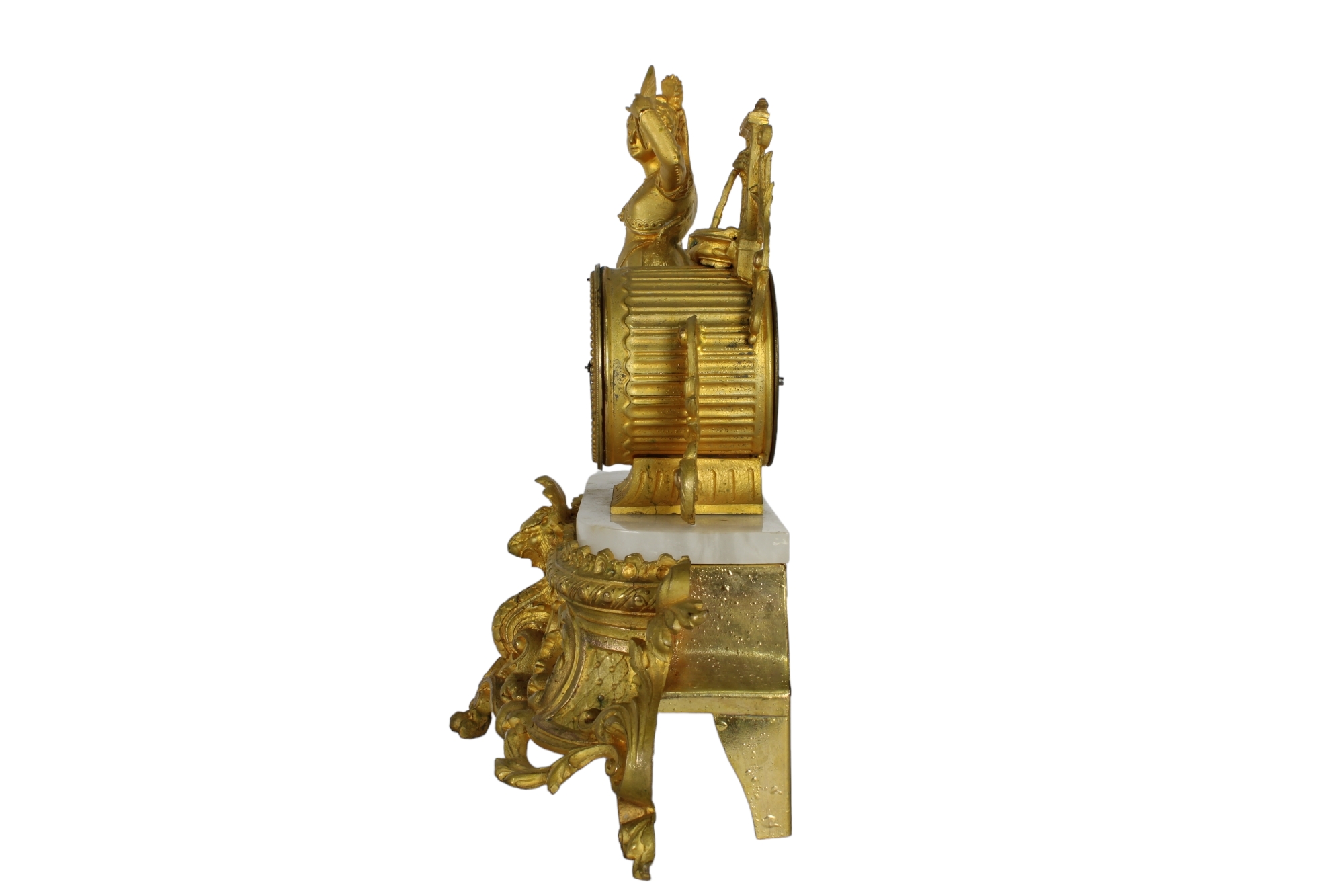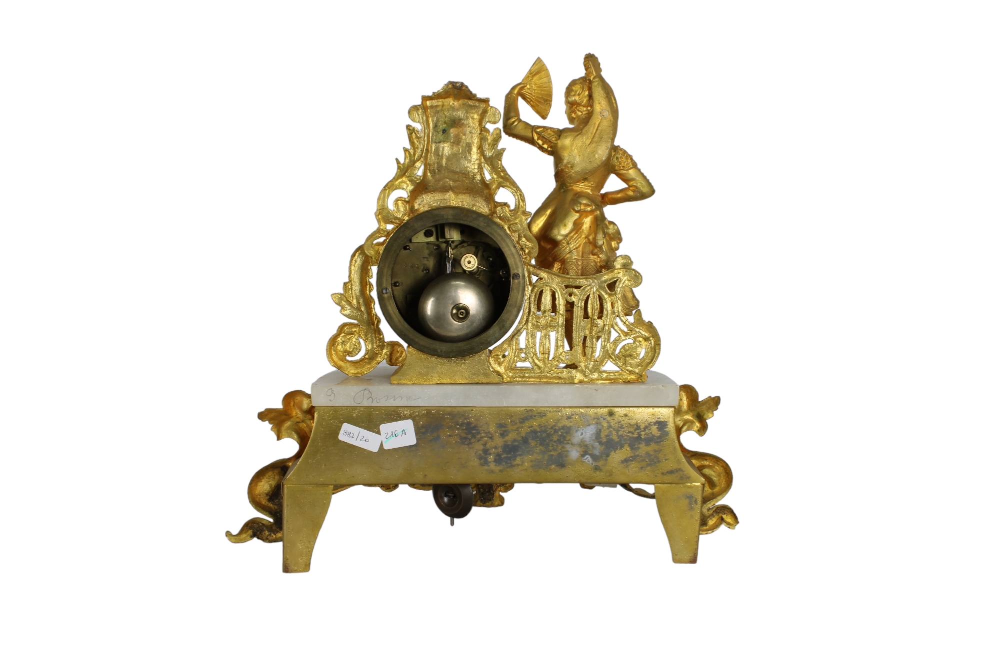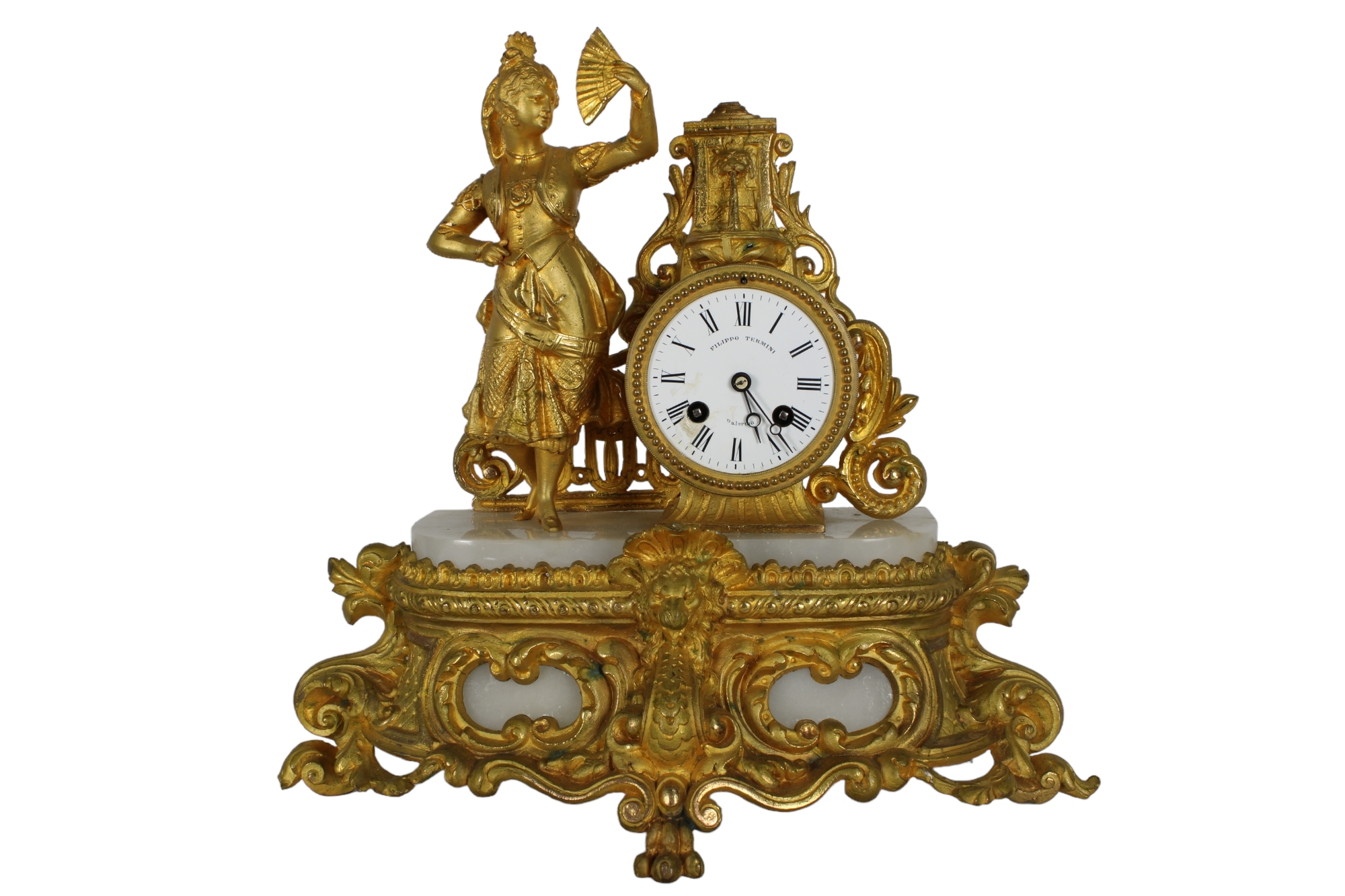 OROLOGIO in metallo dorato e alabastro Raff Donna con ventaglio firmato Filippo termini Palermo fine XIX secolo h cm 36 x 38 x 15