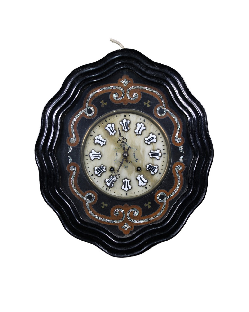 OROLOGIO A OCCHIO DI BUE in legno ebanizzato e tarsie in bosso e materiale pregiato, quadrante in alabastro fiorito e numeri in smalto Francia XIX secolo h cm 58 x 50