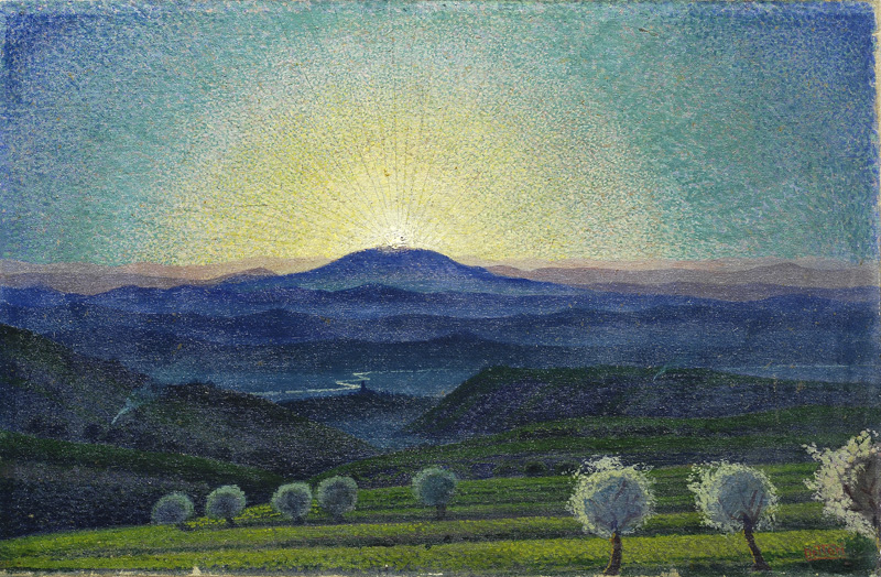 Gerardo Dottori (Perugia, 1884 - 1977) PAESAGGIO UMBRO, ANNI ‘40 Olio su tela riportata su tavola, cm. 40x60 Firma in basso a destra. Certificato e autentica su foto Archivio Dottori, n. inventario 2196