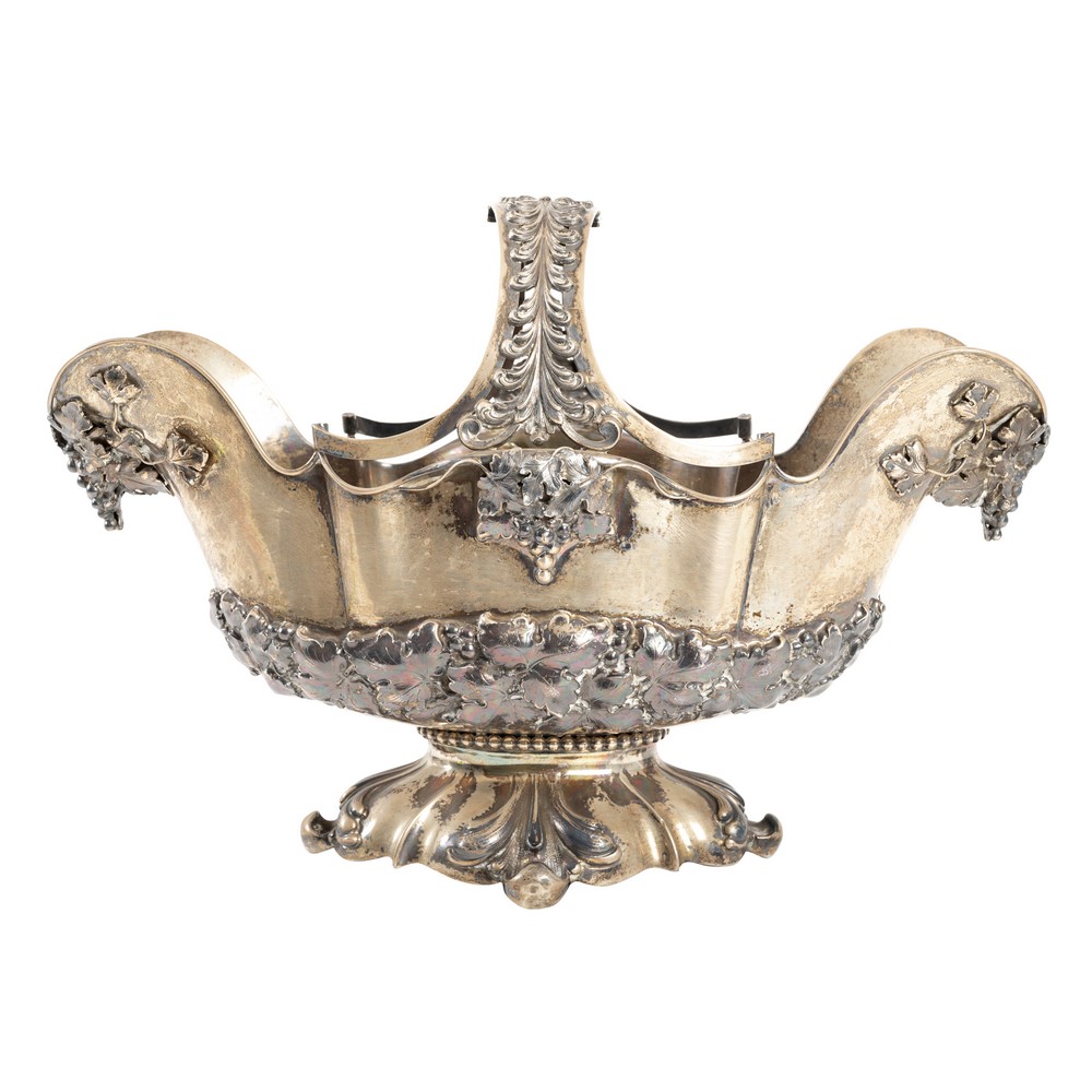 GRANDE CESTO in argento riccamente lavorato con tralci d’uva. Argentiere Le argenterie di Milano di Fiorentini Guido (g. 2768).