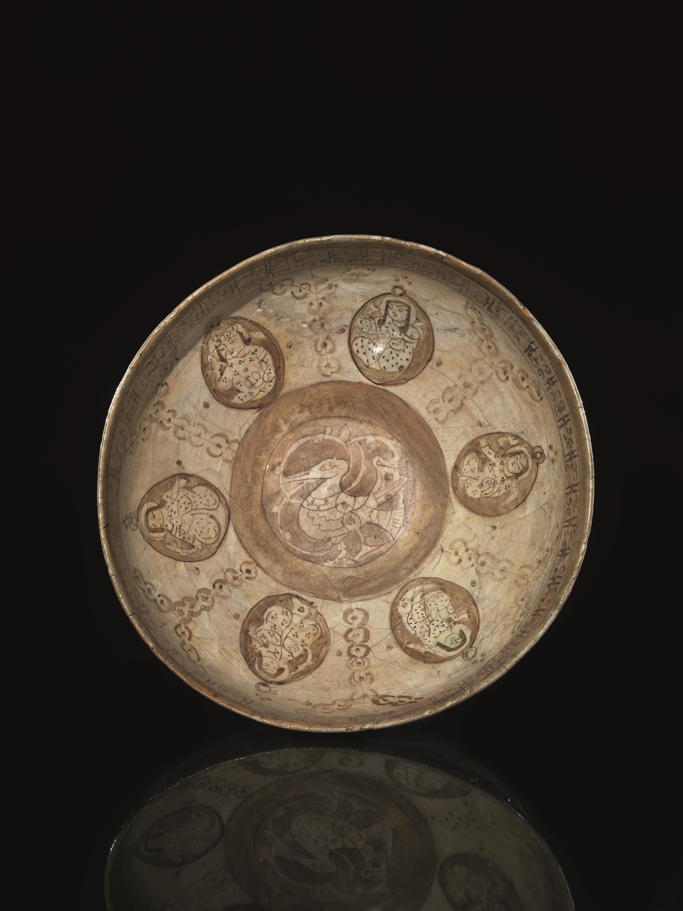 Coppa Nishapur, Iran XI sec in maiolica decorata con volatile al centro e figure entro riserve ovali separate da decorazioni geometriche, diam cm 19,7 restaurata