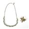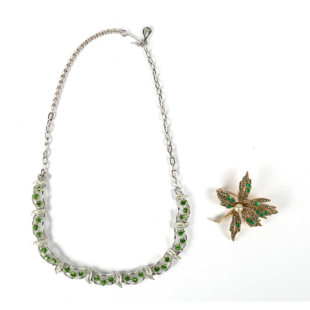 Collier in metallo argentato con foglie e strass verdi, marchio di produzione.