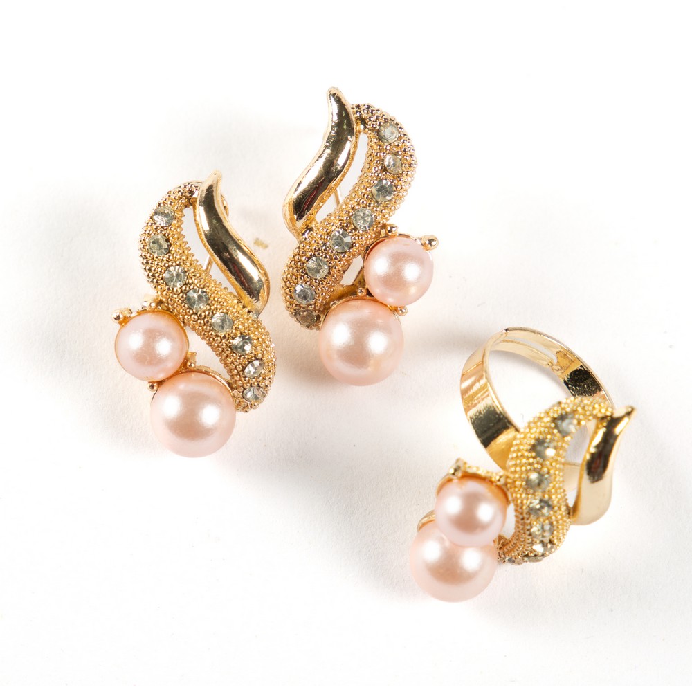 Anello regolabile con perle di colore rosa e zirconi in metallo dorato.