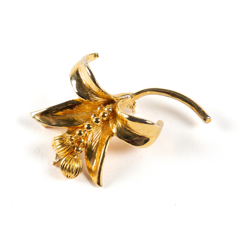 Spilla a forma di fiore in metallo dorato con pistilli basculanti.