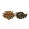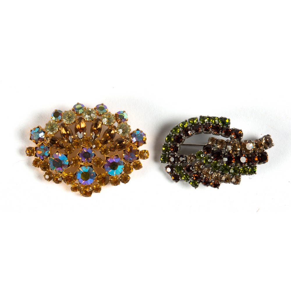 Spilla a forma di foglia con strass di colore verde, marrone e ambra.