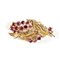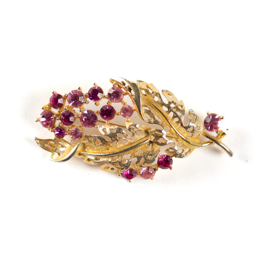 Spilla in metallo dorato con foglie e fiori in strass rosa e fucsia.