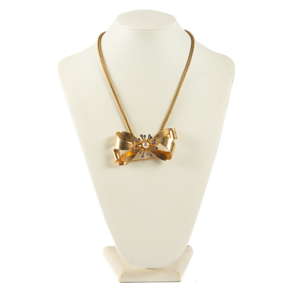 Collana spilla a forma di fiocco con strass blu e perla centrale Coro, marchio di produzione.