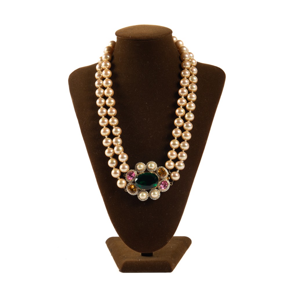 Collana a doppio filo di perle con grande susta gioiello in strass nei colori verde, topazio e rosa, marchio di produzione.