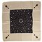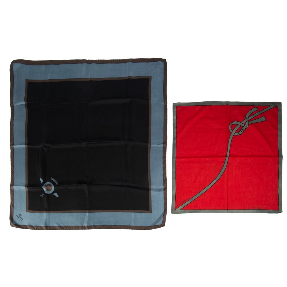 Tre foulard in cotone, uno rosso e grigio con grande; Uno celeste polvere, grigio e nero; Uno beige e nero con decori di gemme preziose marroni. Firmati Roberta di Camerino.