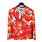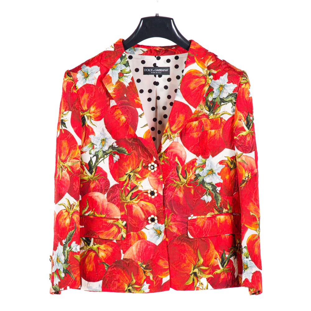 Giacca in di broccato a fantasia pomodoro, foderata in tessuto a pois di seta, collezione primavera estate 2011/2012, bottoni personalizzati, due su ogni manica e tre sulla chiusura anteriore.