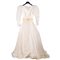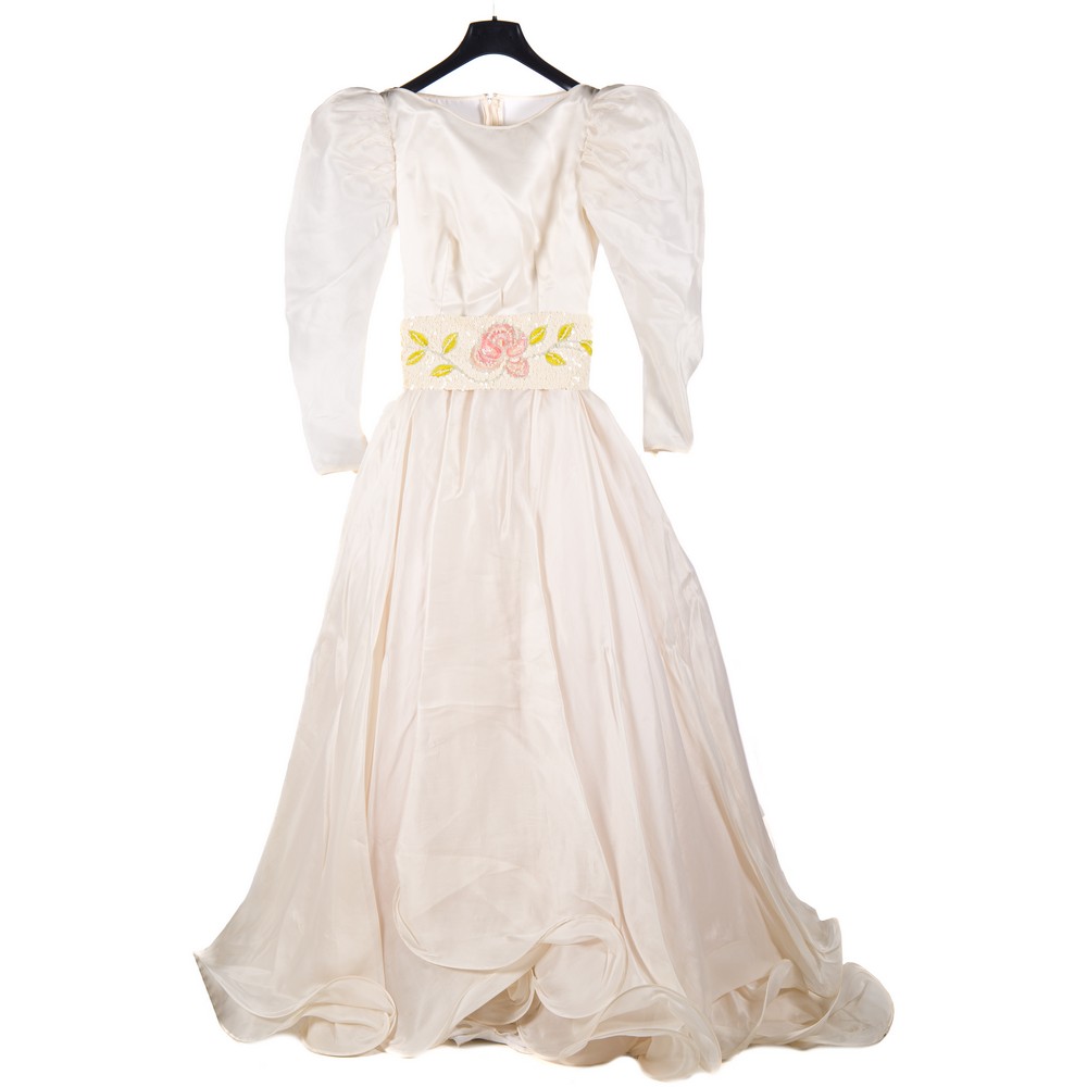 Abito da sposa sartoriale in seta e organza color bianco, busto sagomato, collo circolare, manica a sbuffo, gonna ampia.