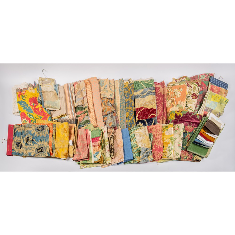 4 tirelle Manuel Canovas, 4 scampoli Braquenie, 2 tirelle Bevilacqua, Blue Home, Casal, 2 tirelle Lisio, 3 tirelle Lorenzo Rubelli, Etro, Edmond Petit, Fadini e Borghi, 2 scampoli grandi, Dedar, Pierre Frey, 2 tirelle Lelievre, Burger, Bises,T.C. Paris damasco in seta.