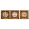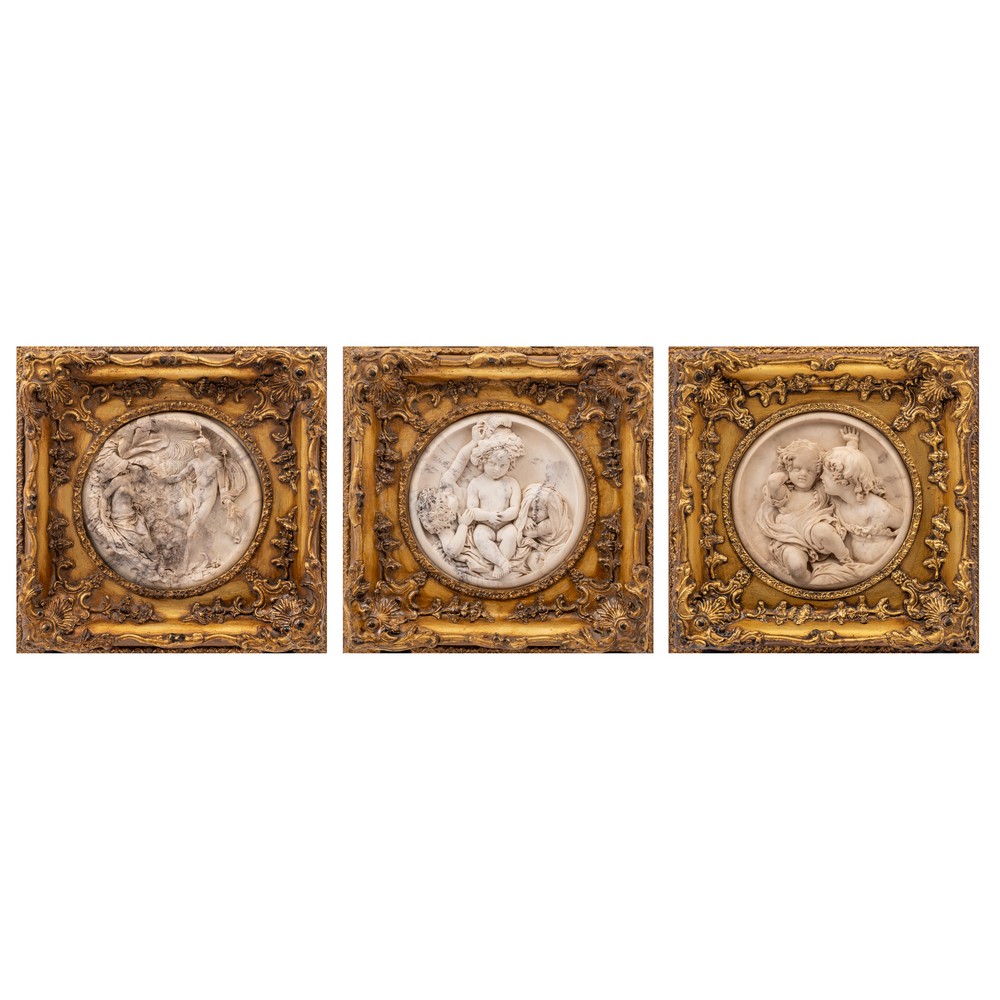 TRE PICCOLI QUADRI del XX secolo in pasta marmorea raffiguranti bambini e scena mitologica entro cornici in legno e pastiglia dorata.