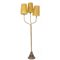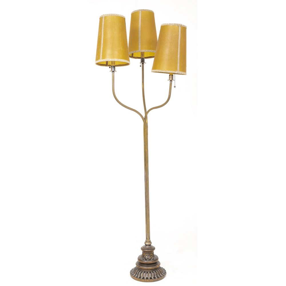 LAMPADA da terra Liberty a tre luci in ottone, base in legno e paralume.