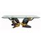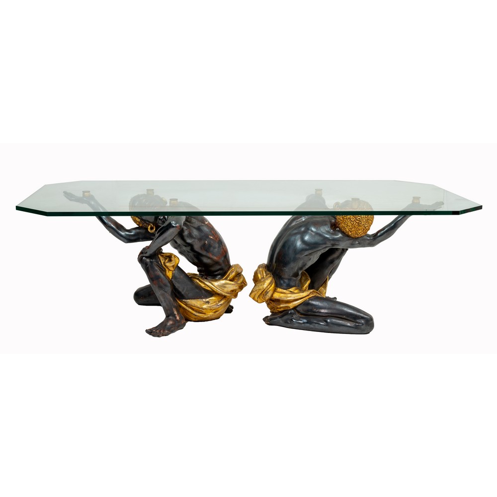 TAVOLINO da salotto realizzato con due sculture in legno ebanizzato e dorato raffigurante mori che sorreggono il piano in vetro.
