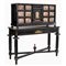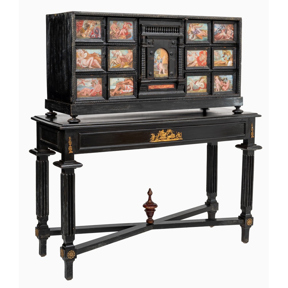 Monetiere in legno ebanizzato con pitture su vetro raffiguranti "Scene neoclassiche", consolle non coeva.