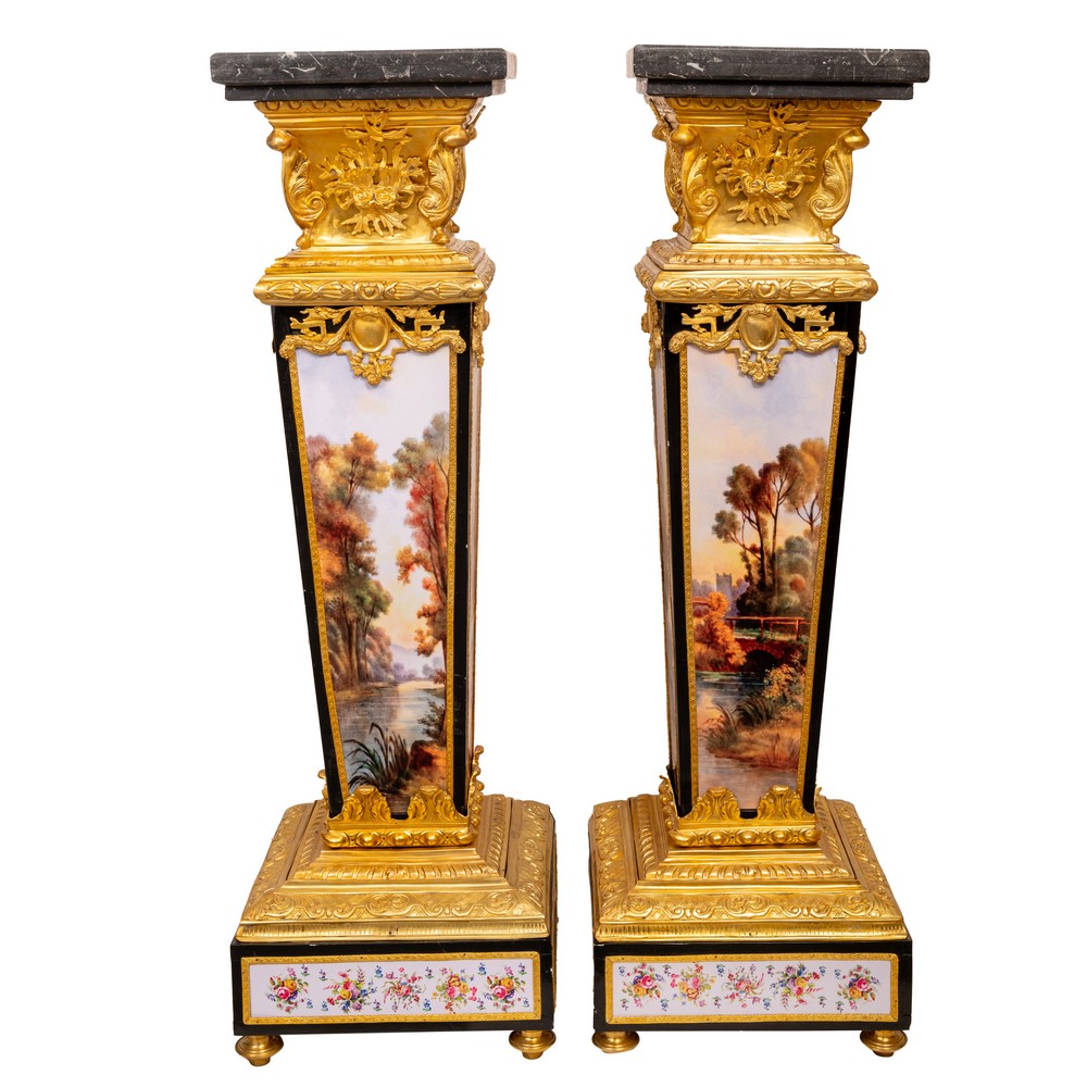 Coppia di colonne in bronzo dorato, doratura a mercurio, con placche in porcellana decorate e dipinte a mano raffiguranti scene galanti e paesaggi, piani in marmo nero del Belgio.