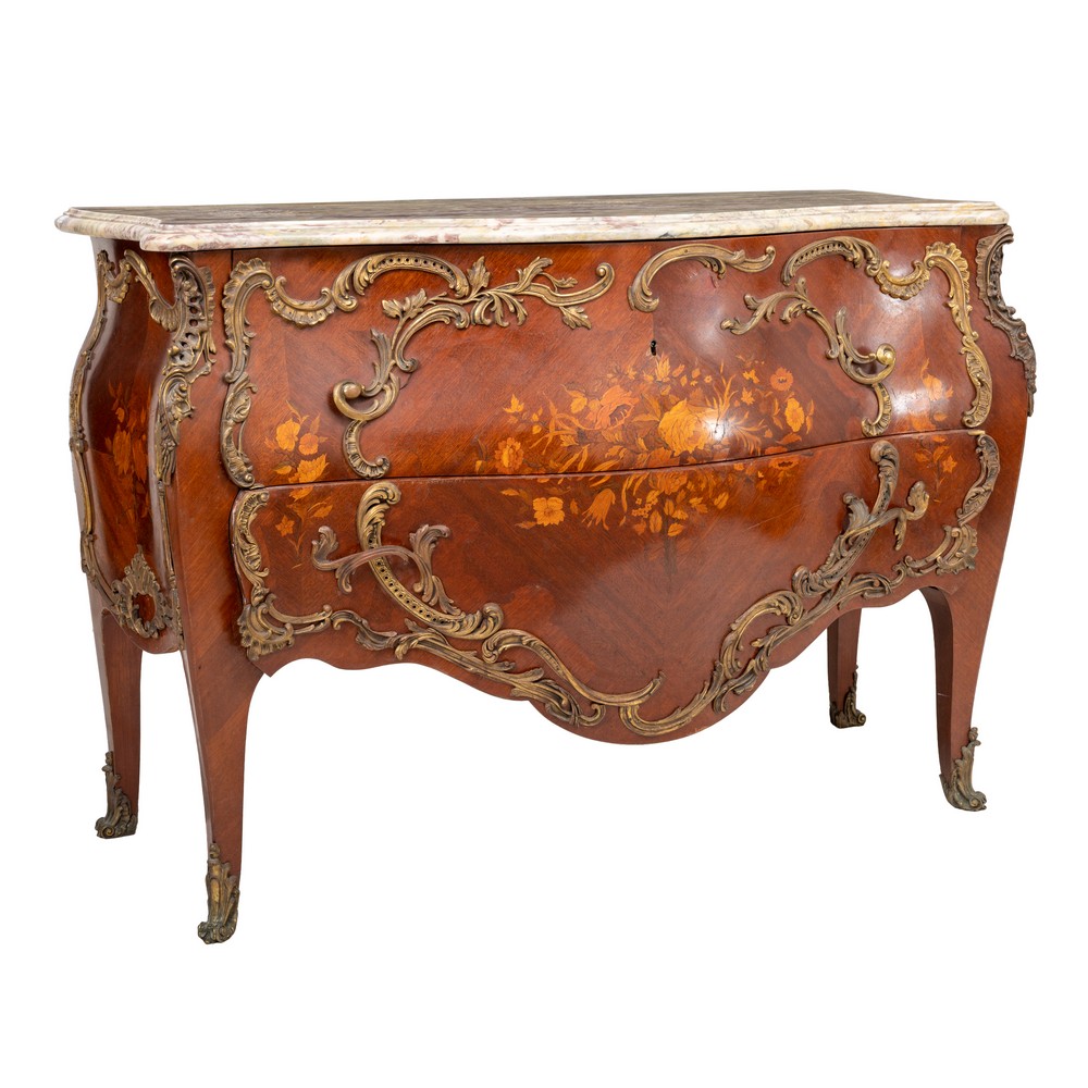Cassettone stile Luigi XV in mogano riccamente intarsiato a motivo floreale e fogliaceo, guarnizioni in bronzo, piano in marmo brecciato.