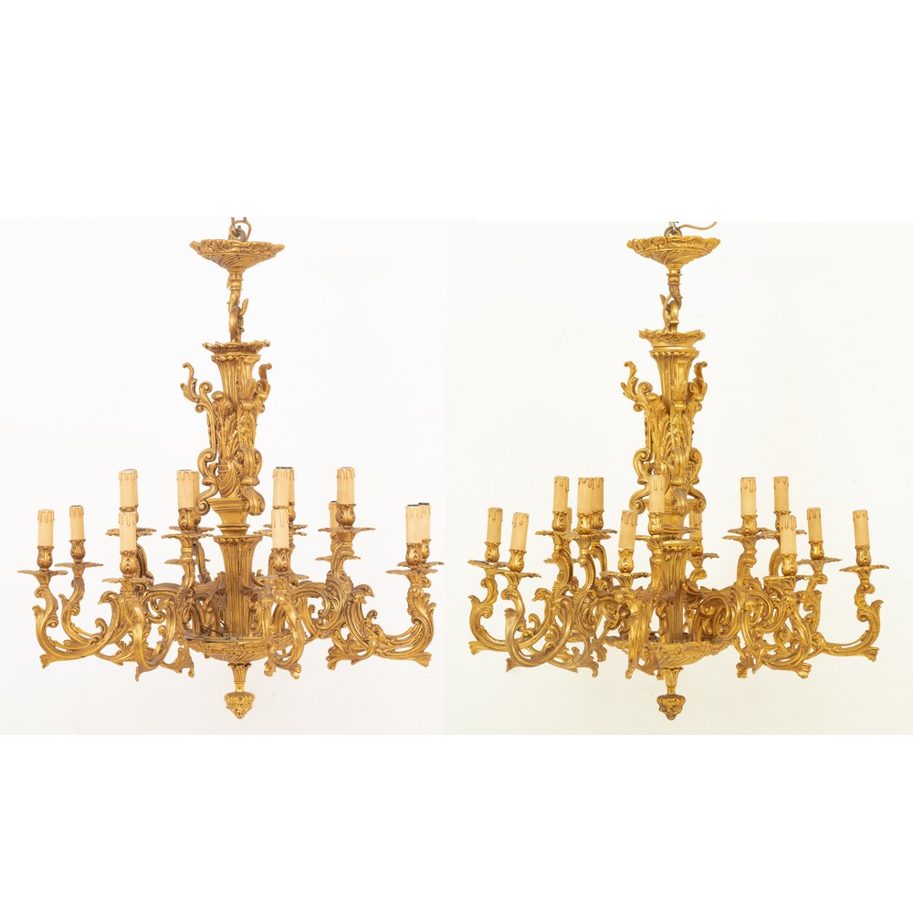 COPPIA DI LAMPADARI a sedici luci in bronzo dorato.