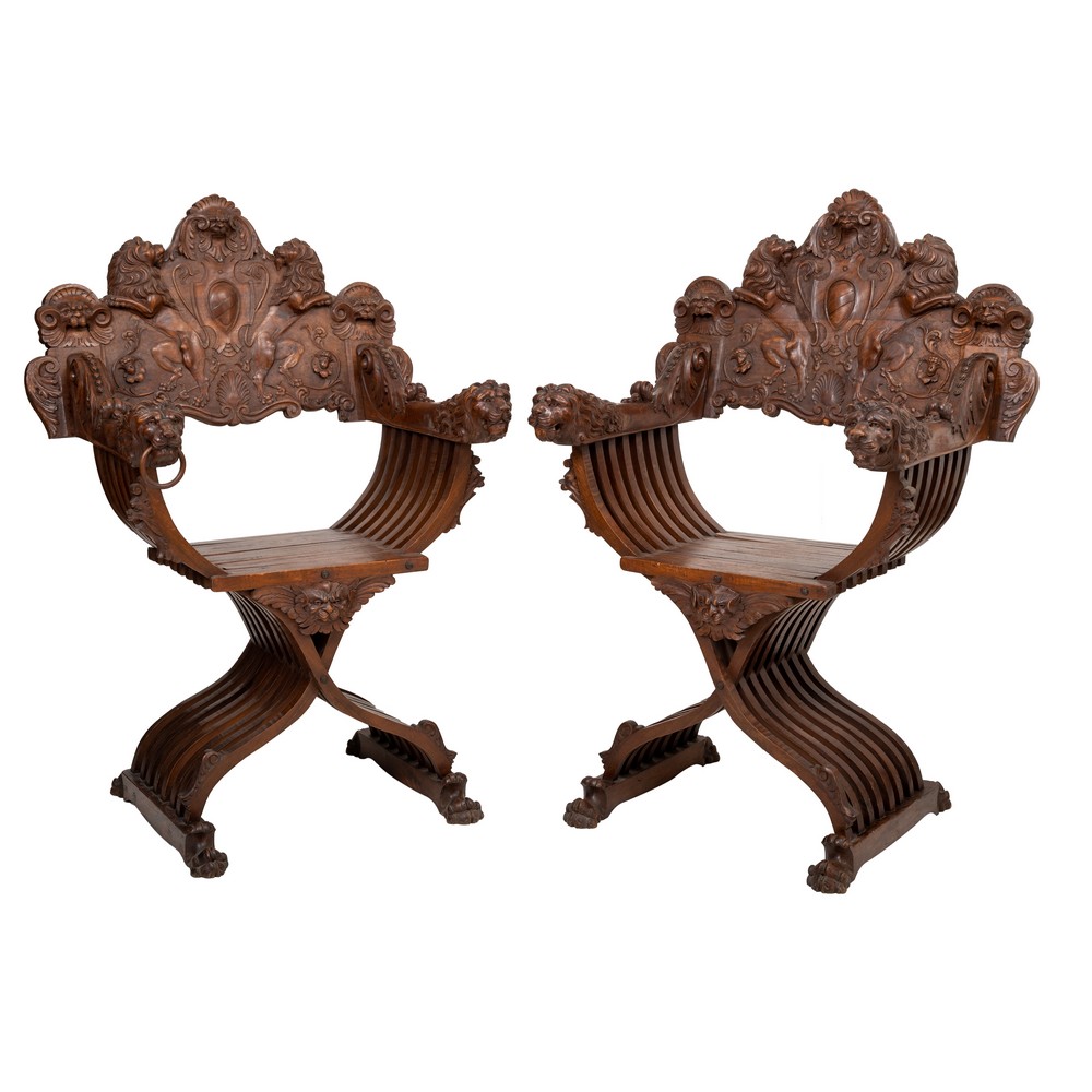 COPPIA DI POLTRONE savonarola di gusto barocco in legno di noce riccamente scolpito a motivo floreale e leoni con stemma nobiliare al centro.