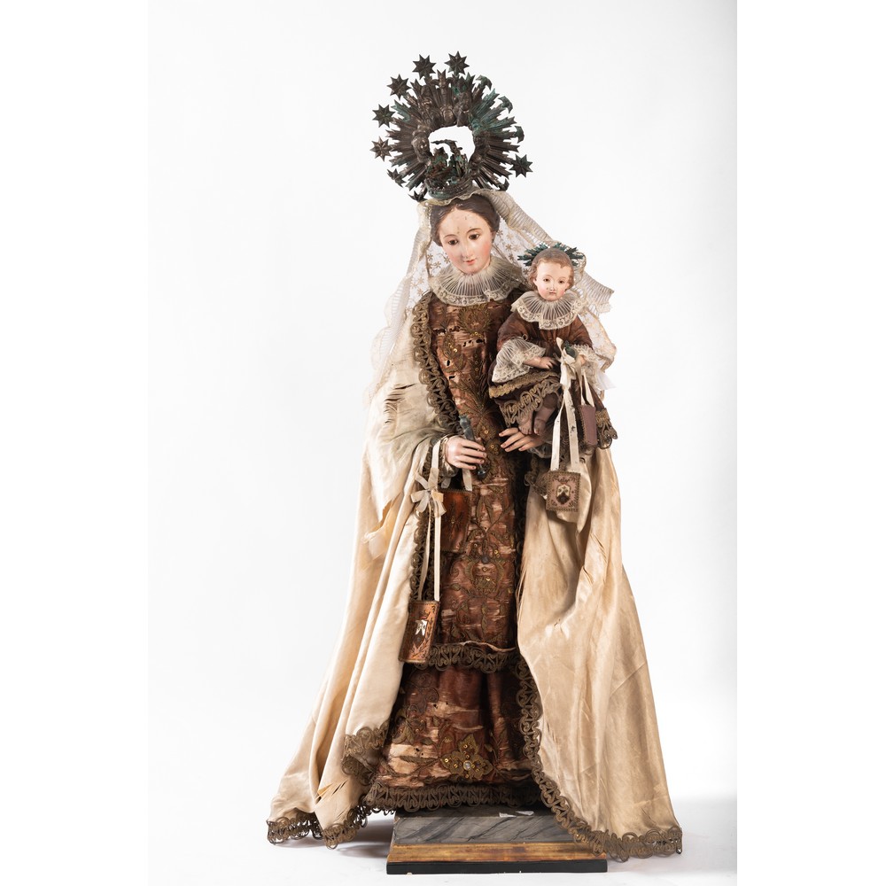 Scultura in legno laccato raffigurante "Madonna con Bambinello" con corona e stellare in argento, abito riccamente ricamato a mano e fili dorati.