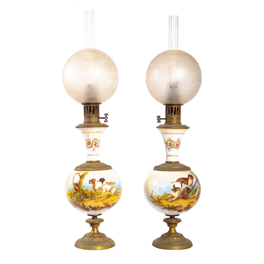 COPPIA DI LUMI a petrolio in opaline dipinta con base ed applicazioni in ottone, bocce e tubi in vetro.